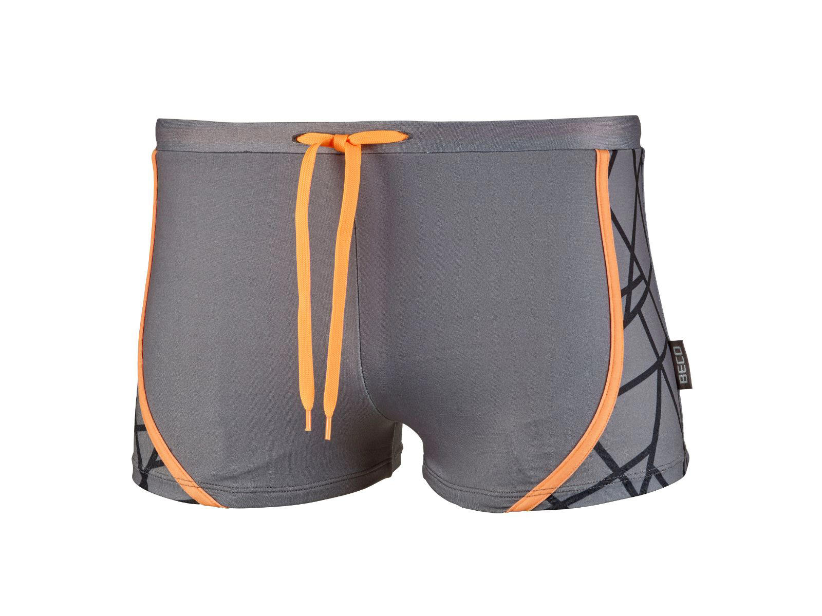 BECO "Tangram Style" badebukser til mænd. Sporty design med grafisk sort mønster på gråt stof og iøjefaldende orange detaljer. Lavet i 100% polyester med UV-beskyttelse 50+. Foret foran og med inderbuks.