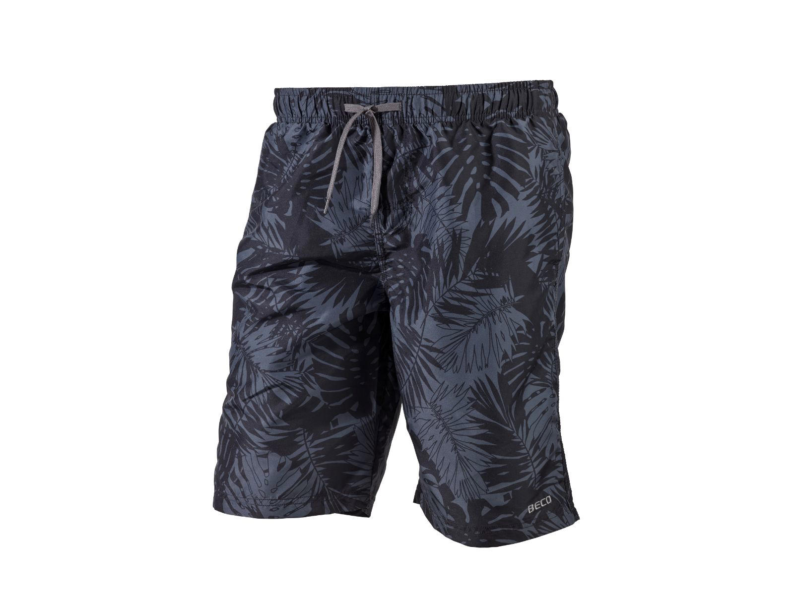 BECO badeshorts til mænd. Behagelig, løs pasform. Flot design i sort med gråt print med palmeblade. Lavet i hurtigttørrende mikrofiber i 100% polyester. Foring i polyester. Elastisk taljebånd med bindebånd. Inderbuks og tre praktiske lommer. Benlængde: 50 cm.