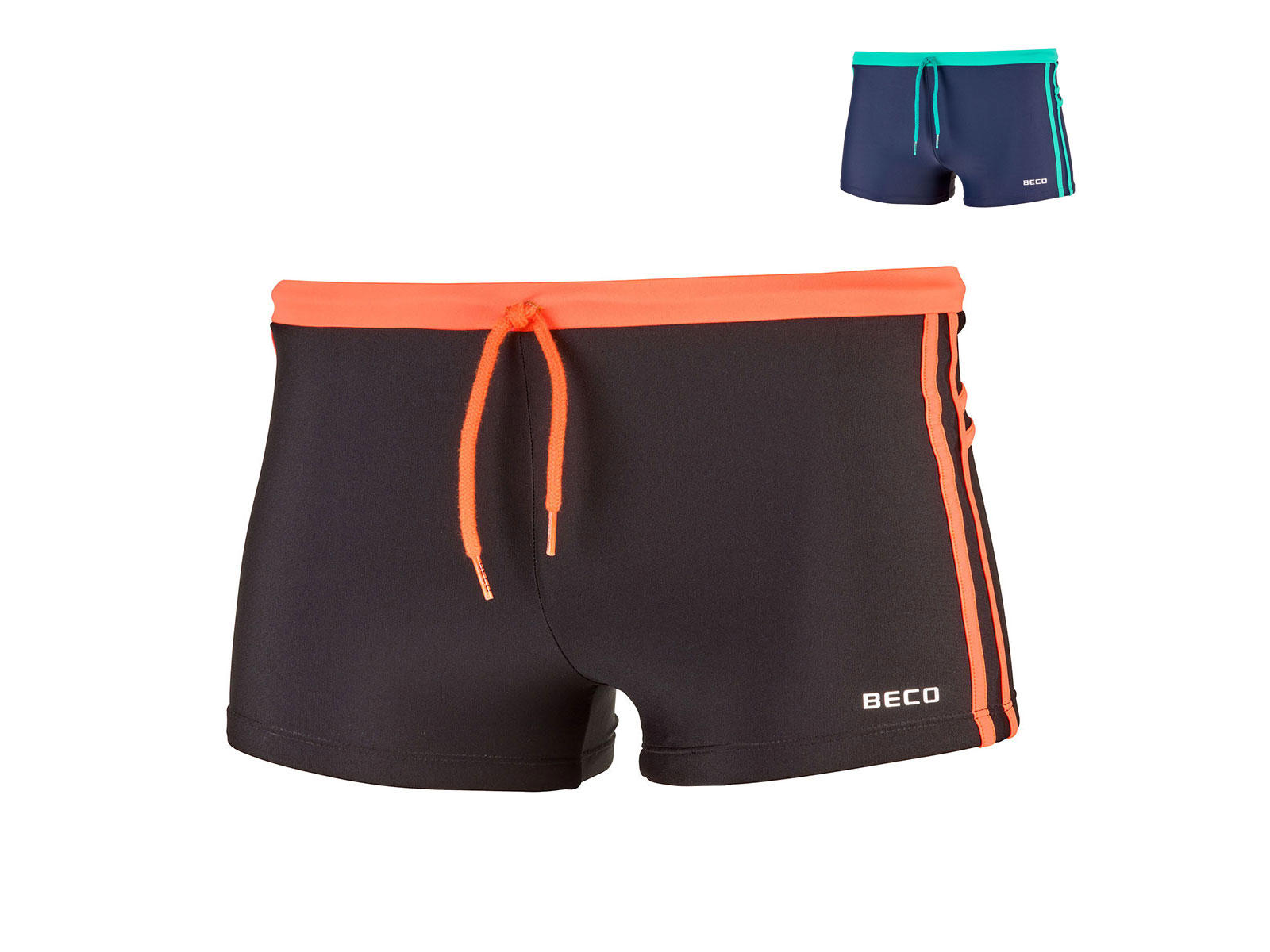 BECO badebukser med kontraststriber til mænd. Perfekte til intensiv svømmetræning og fitness i vand. Almindelig pasform med kort benlængde på ca. 25 cm. Snøre i taljen og fuld foring. Fremstillet i 80% polyamid og 20% elastan.