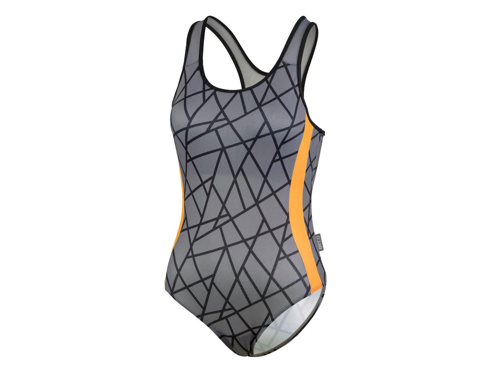 BECO "Tangram Style" badedragt til kvinder. Sporty design med grafisk sort mønster på gråt stof og iøjefaldende orange detaljer. Med elegant racerback. Lavet i 100% polyester og med foring i polyester-/elastanblanding. UV-beskyttelse 50+. Med støttebånd under barmen. Med udtagelige skåleindlæg og B-skål.