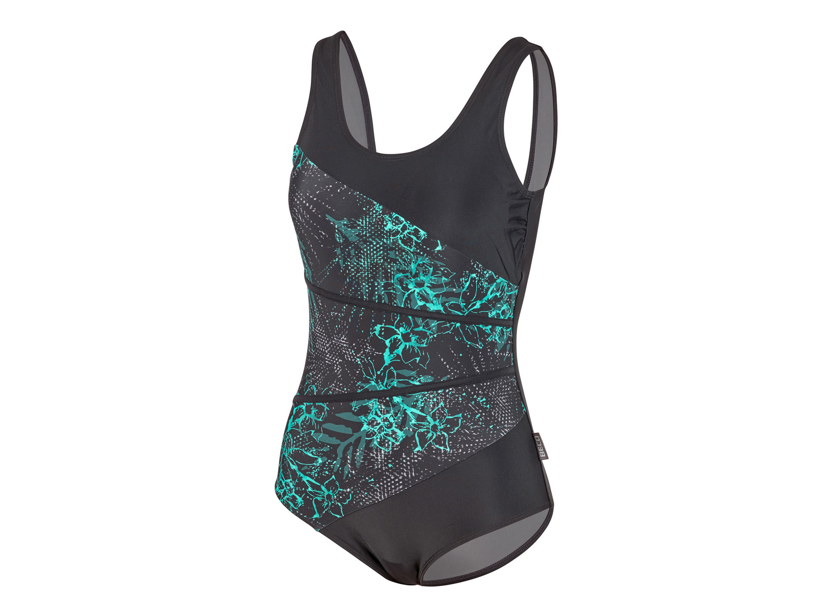 BECO "Mint Flowers" badedragt til kvinder. Fortryllende blomster design i sort og turkis. C-skål med indsyede indlæg. Badedragten har stærk powermesh på forsiden som giver en god shaping effekt. Lav ben skæring. 80% polyamid, 20% elastan.