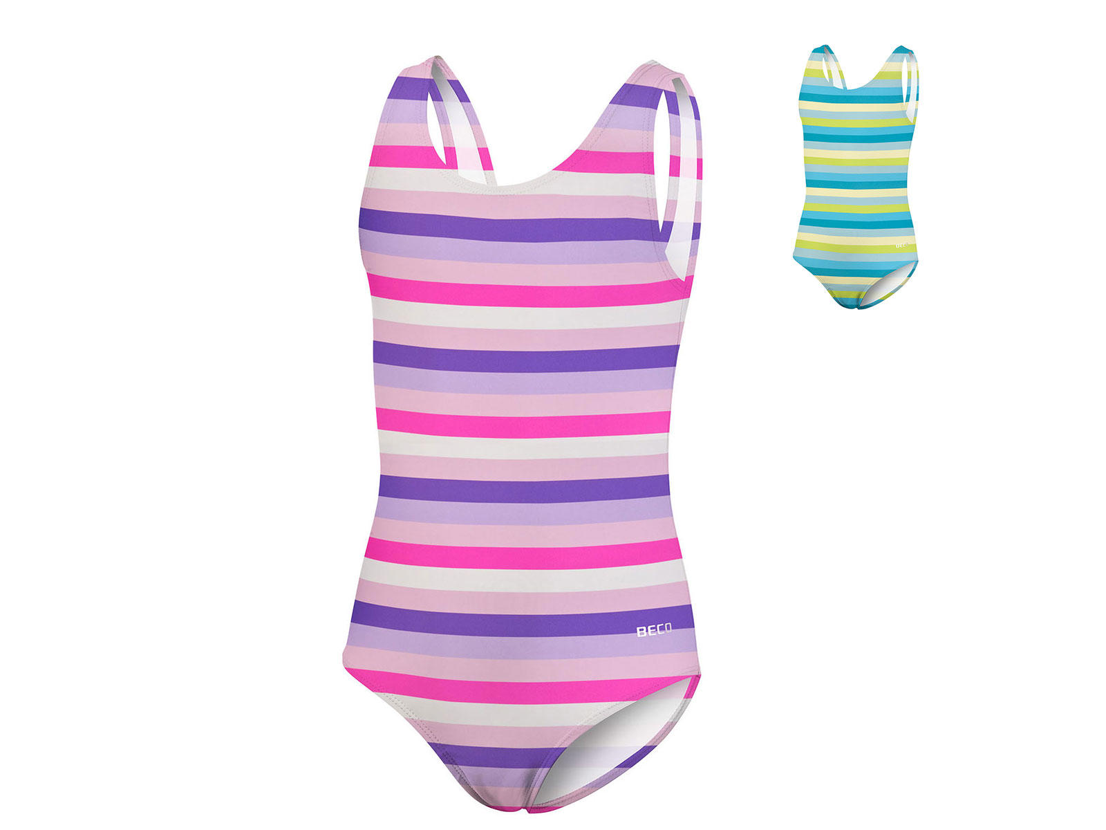 BECO badedragt til piger med friske striber i livlige farver. Scoop neck-design og brede stropper sikrer komfort og støtte, perfekt til svømning og leg. Fremstillet af 80% polyamid og 20% elastan med fuld indvendig foring, der giver ekstra komfort og holdbarhed hele dagen.