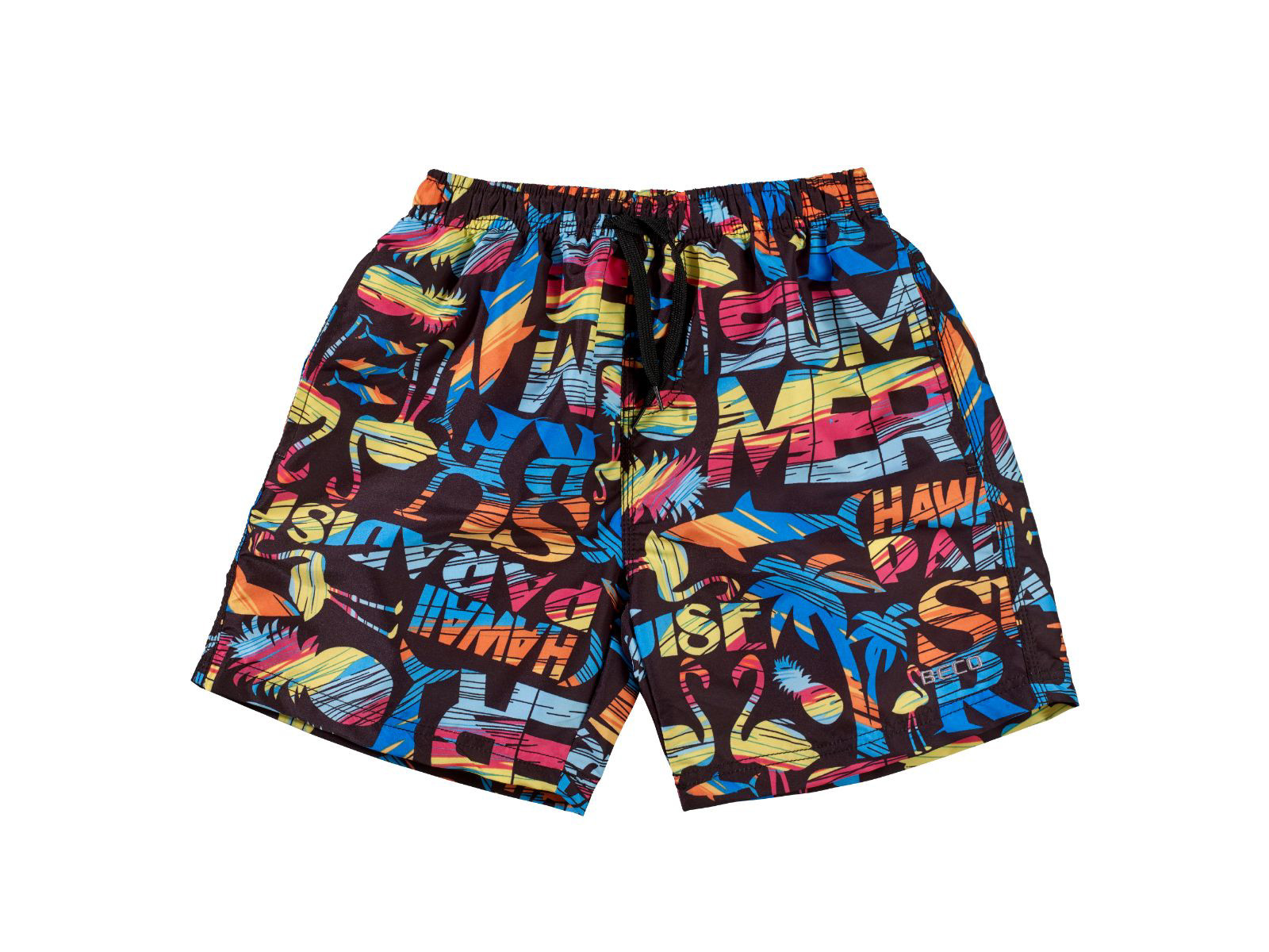 BECO badeshorts til drenge. Sommerligt design i sort med multifarvet print. Lavet i hurtigttørrende mikrofiber i 100% polyester. Foring også i 100% polyester. Elastisk linning med bindebånd og inderbuks. Tre praktiske lommer.