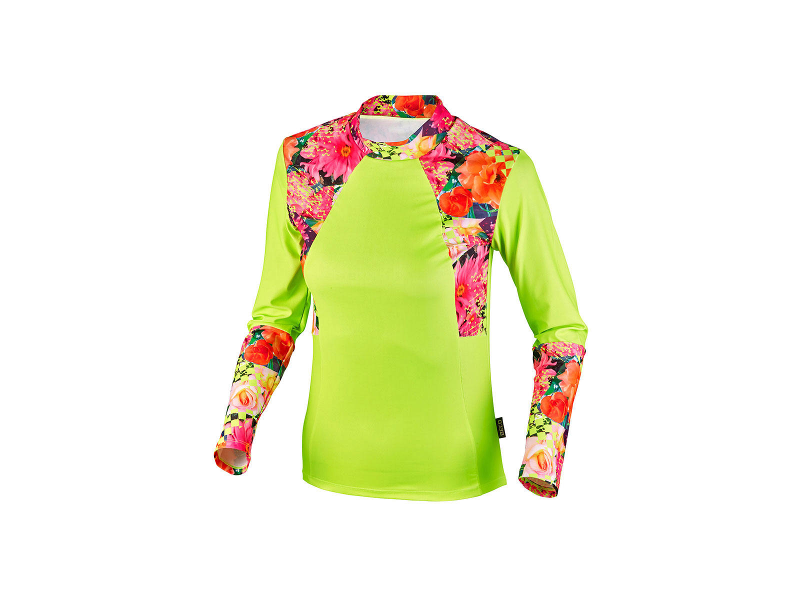 BECO ”Fresh Flowers” svømmetrøje med lange ærmer til kvinder. I en frisk grøn farve med blomsterdesign på underarme, hals og skuldre. Ideel til vandsport ved f.eks. stranden. Fås i str. XS – XL. Fremstillet i 85% polyester og 15% elastan for maksimal komfort og bevægelsesfrihed.