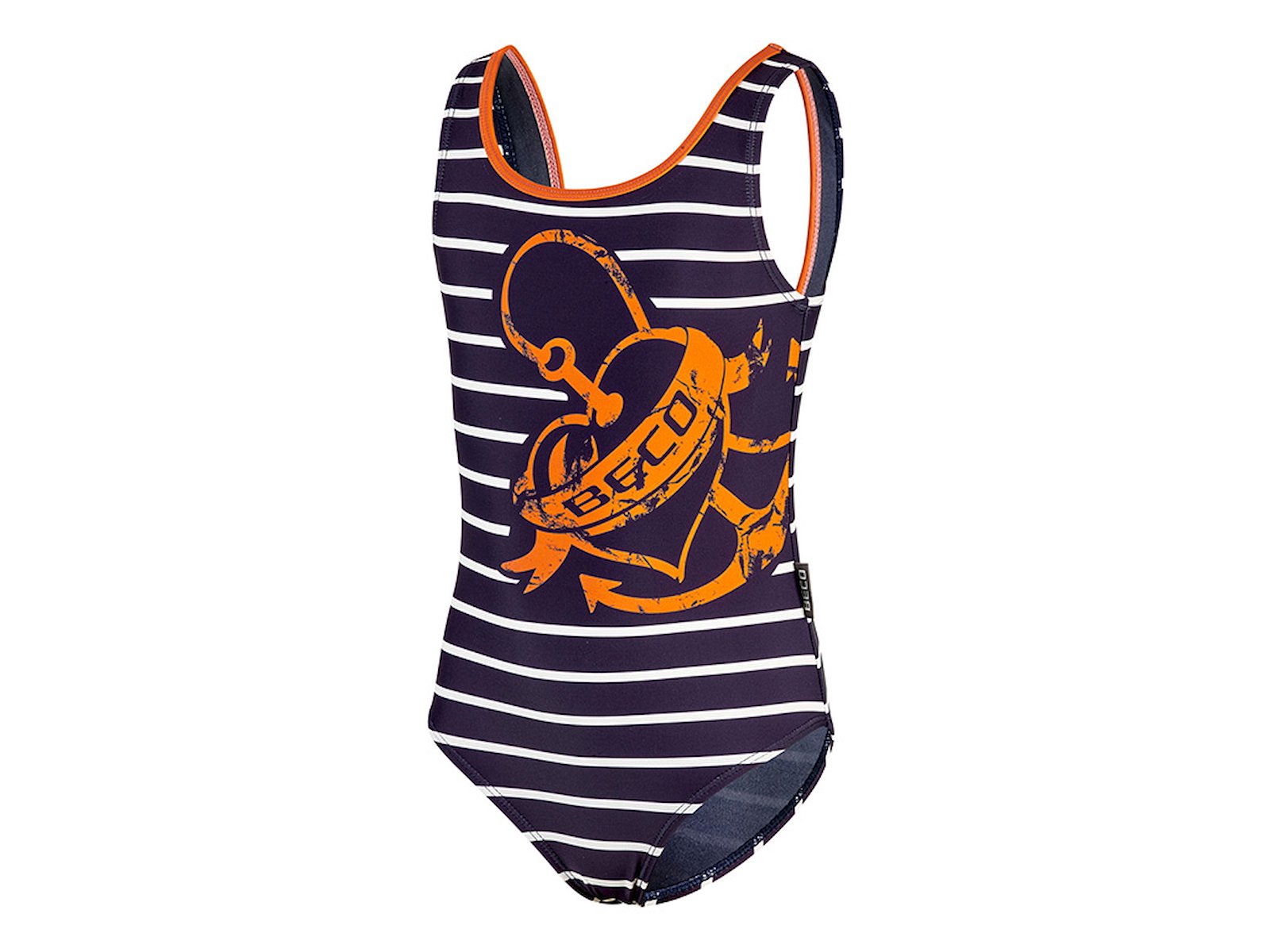 Denne BECO badedragt til piger fra Kids Newport-kollektionen kombinerer et sporty scoop-neck design med en komfortabel U-ryg, der giver fri bevægelighed til både leg og svømning. Modellen er fuldt foret, hvilket øger komforten og giver et stabilt fit, selv når barnet er aktiv i vandet. Materialet i 80 % polyamid og 20 % elastan gør dragten fleksibel, hurtigtørrende og behagelig mod huden. Det flotte marine/orange stribede print med anker-motiv giver et charmerende maritimt look, der passer perfekt til strandture, svømmeundervisning og feriedage.