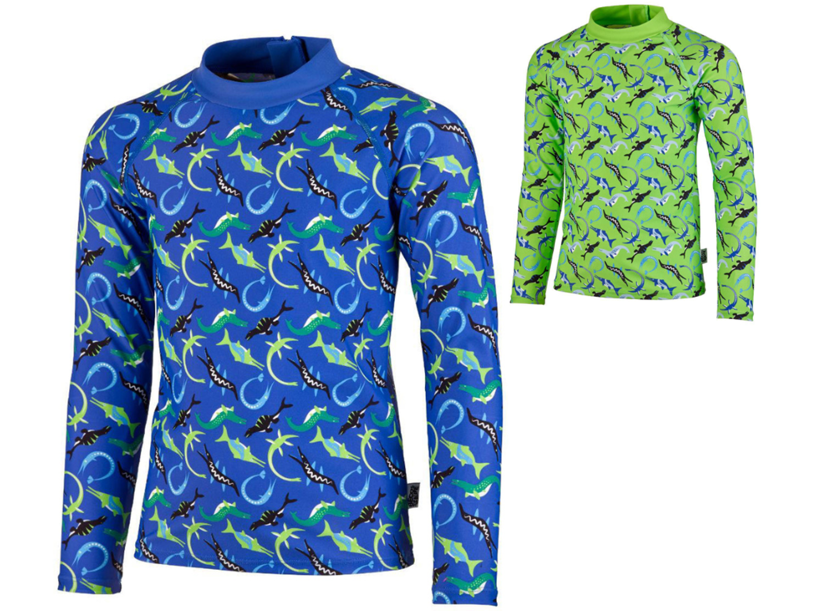 BECO "Ocean Dinos" UV-trøje til drenge. Sporty design med det sødeste havdyrsprint. Lange ærmer og høj krave, som giver god solbeskyttelse i nakken. Lynlås på skulderen. Lavet i slidstærk og blød polyamid-/elastanblanding med UV-beskyttelse 50+.