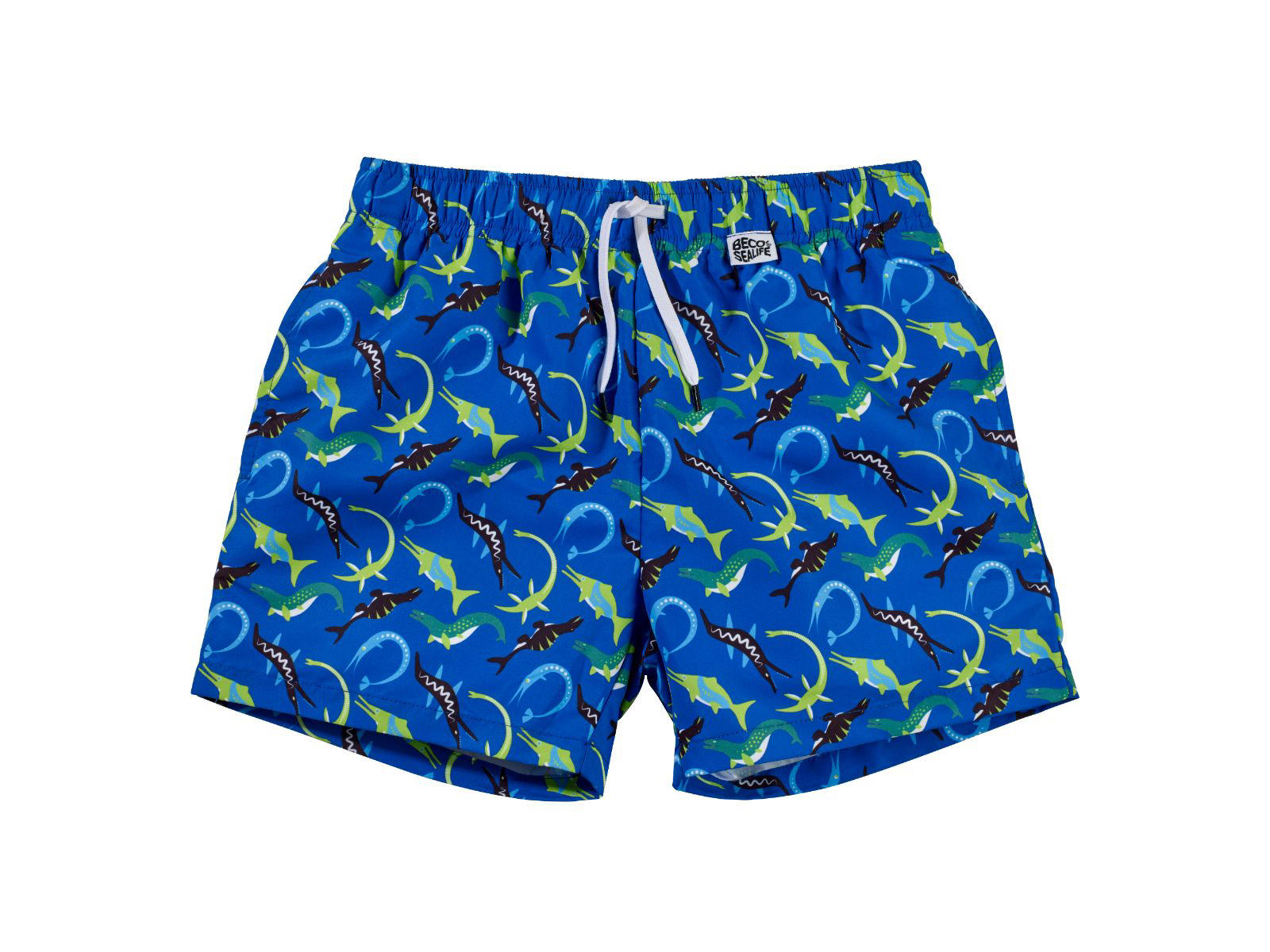 BECO "Ocean Dinos" badeshorts til drenge. Sporty design med det sødeste havdyrsprint. Løs pasform. Lavet i hurtigttørrende mikrofiber i 100% polyester. Foret og med inderbuks. Elastisk talje med bindebånd. Tre praktiske lommer.