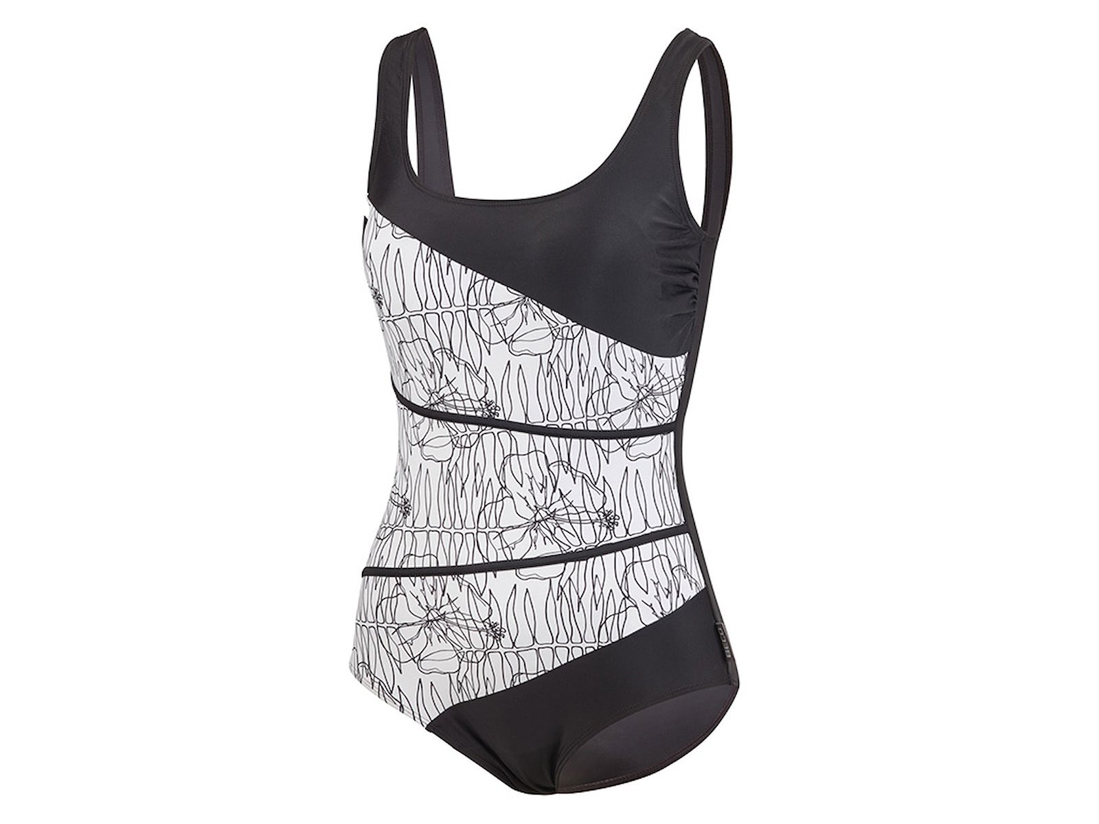 BECO Flower Lines Classic badedragten kombinerer støtte, komfort og et stilrent sort/hvidt grafisk design. Den er fuldt foret og udstyret med indsyede soft cups og elastisk underbustbånd for stabilitet og naturlig form. Power mesh i fronten giver effektiv formende støtte og en glat silhuet. De faste stropper, den runde rygudskæring og den lave benskæring giver et klassisk, sikkert og komfortabelt fit. Fremstillet i 80 % polyamid og 20 % elastan. OEKO-TEX® Standard 100 certificeret. Str. 38–54.