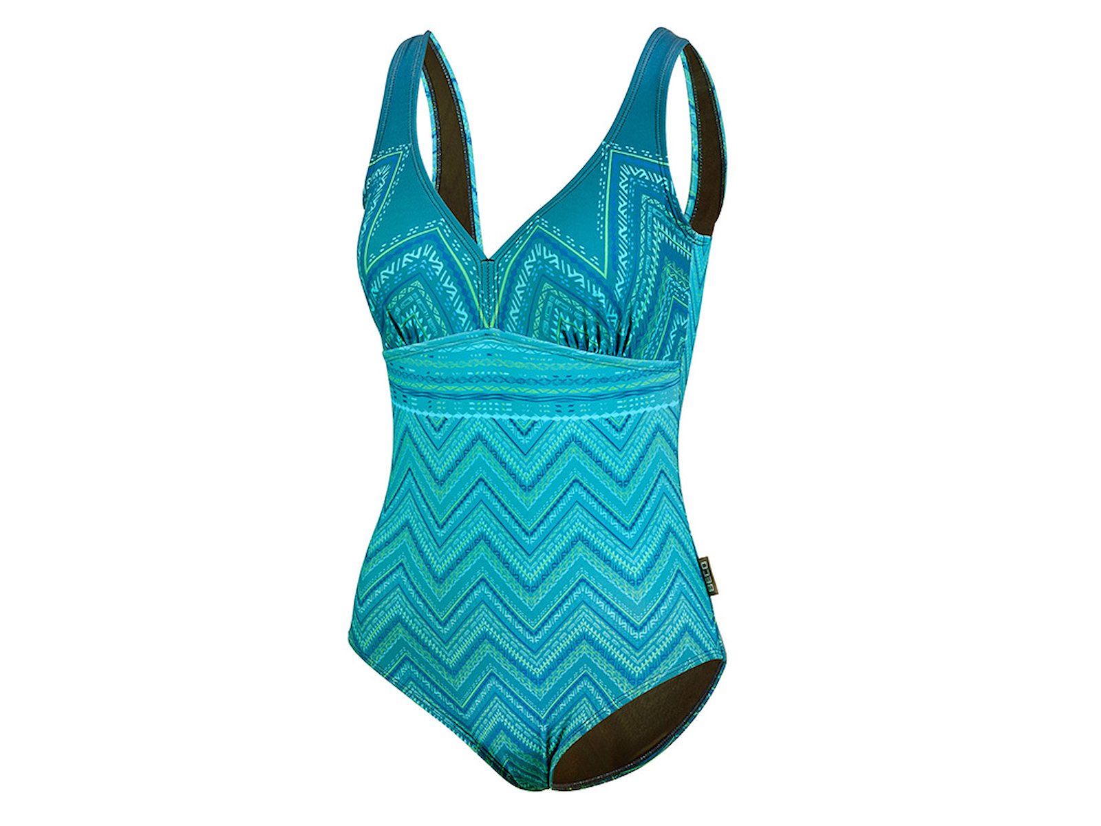 BECO Ocean Ribbons badedragten kombinerer havinspirerede petrolnuancer med et støttende og velsiddende design. Modellen er fuldt foret og har blød foring samt indsyede soft cups, som giver naturlig form og stabil komfort. Power mesh i fronten skaber en let formende effekt, der glatter og støtter. Den dybe V-neck skaber et feminint udtryk, mens den dybe U-ryg giver fri bevægelighed. Den medium høje benskæring giver en elegant og flatterende silhuet. Fremstillet i 80 % polyamid og 20 % elastan. Str. 38–46.