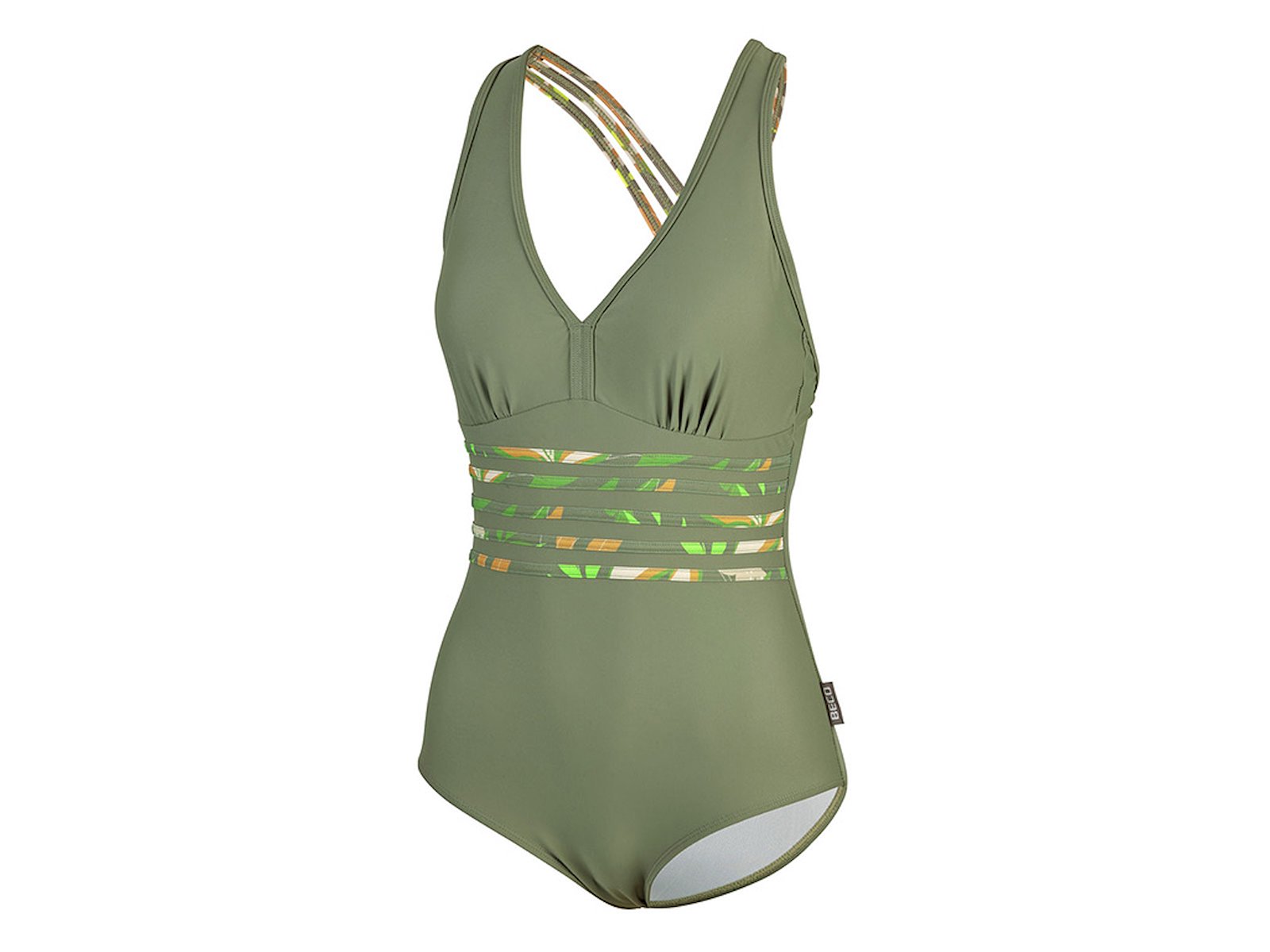 BECO Gala badedragten kombinerer elegant taljering med funktionel støtte. Modellen er fuldt foret og har indsyede indlæg samt et støttebånd under barmen, der giver et naturligt og stabilt løft. Power Mesh i både mave- og rygpaneler skaber en formende og glattende effekt uden at gå på kompromis med komforten. De krydsede stropper giver et sikkert hold, og den let afrundede rygudskæring understøtter et feminint fit. Lavt bensnit for klassisk dækning. Fremstillet i 80 % polyamid og 20 % elastan. OEKO-TEX® Standard 100 certificeret. Str. 38–48.