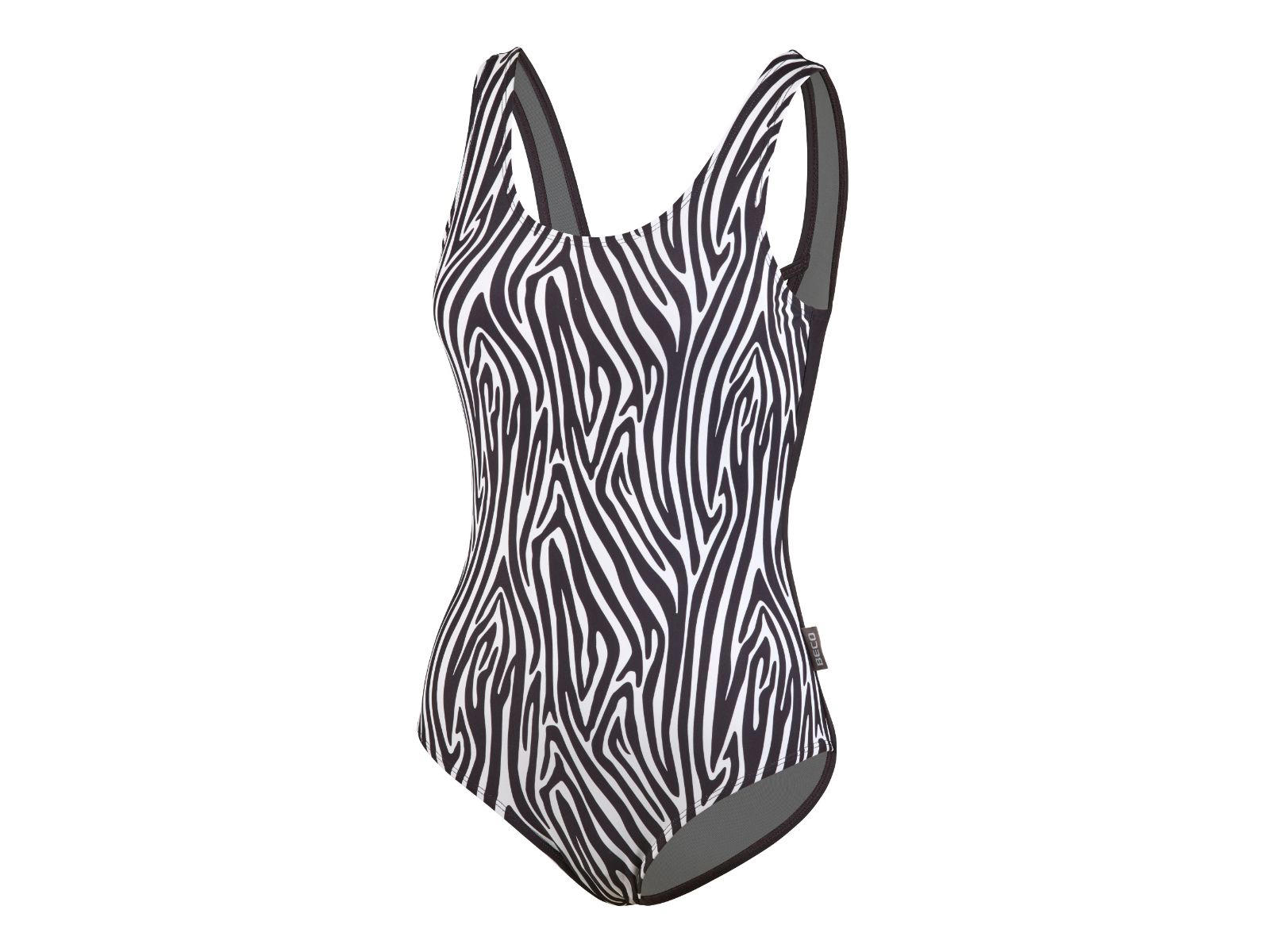 BECO "Zebra Vibes" badedragt til kvinder. Superelegant design med sort-/hvide zebrastriber og brede skulderstropper. Lavet i blød polyamid-/elastanblanding. Dyb rygudskæring og elegante krydsstropper. Med formende og støttende Powermesh-foring i polyester-/elastanblanding. Faste skåleindlæg og C-skål.