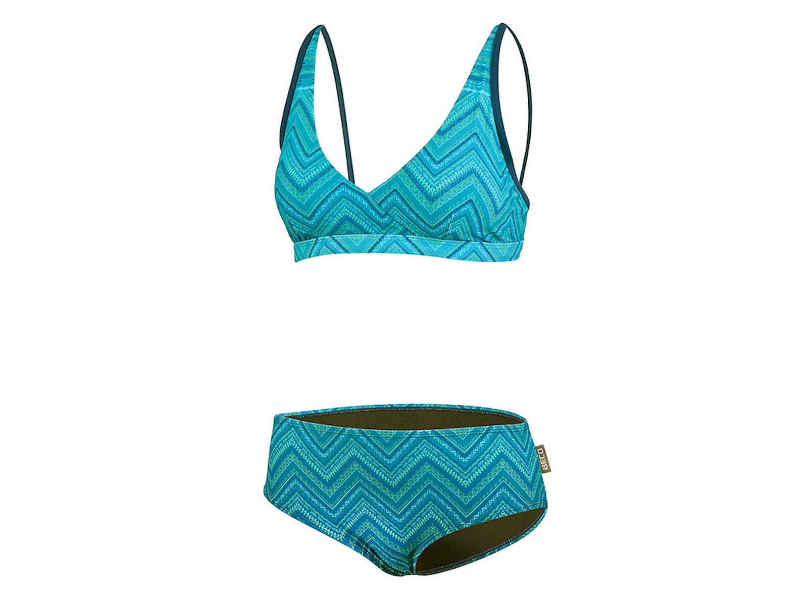 BECO Ocean Ribbons bikinisættet kombinerer smukke havfarver med høj komfort og fleksibilitet. Overdelen er fuldt foret og har udtagelige indlæg, så pasformen kan tilpasses efter behov. Støttebånd under barmen giver stabilitet, mens justerbare stropper sikrer et individuelt fit. Det feminine wrap-design giver let løft og et behageligt hold. Underdelen i Classic Mid-Rise har en sidehøjde på ca. 10,5 cm, lav benskæring og en harmonisk, klassisk silhuet. Fremstillet i 80 % polyamid og 20 % elastan i et petrolfarvet bølgemønster. Str. 38–46.