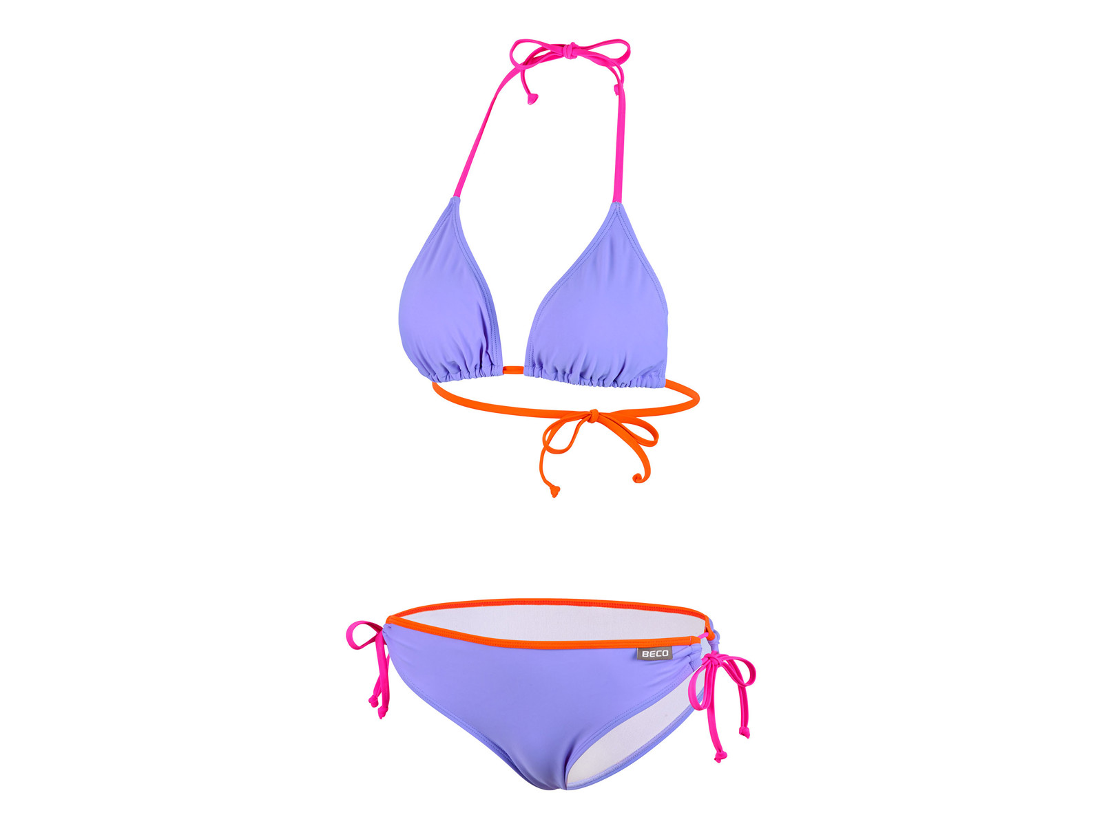 BECO "Colour Block" bikini til kvinder, med trekantsoverdel og underdel med bindebånd i siderne. Flotte farver med sporty stemning. Lavet i en blød polyamid-/elastanblanding og er fuldt foret. B-skål med udtagelige indlæg.