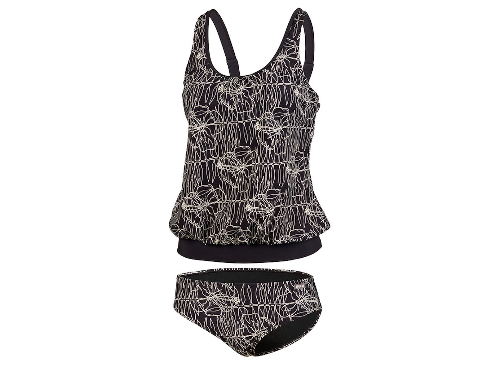 BECO Flower Lines tankinisættet giver en elegant silhuet og behagelig støtte. Overdelen har indsyede soft cups og et elastisk støttebånd under barmen, som sikrer stabilitet og naturlig form. Den løse bluseform falder let omkring kroppen og giver bevægelsesfrihed, mens de justerbare stropper og den lige rygudskæring sikrer en fleksibel pasform. Den tilhørende bikiniunderdel i Regular Fit har en sidehøjde på ca. 7 cm, hvilket giver en flot og klassisk profil. Fremstillet i 80 % polyamid og 20 % elastan med Flower Lines-seriens sort/hvide grafiske look. OEKO-TEX® Standard 100 certificeret. Str. 38–48.