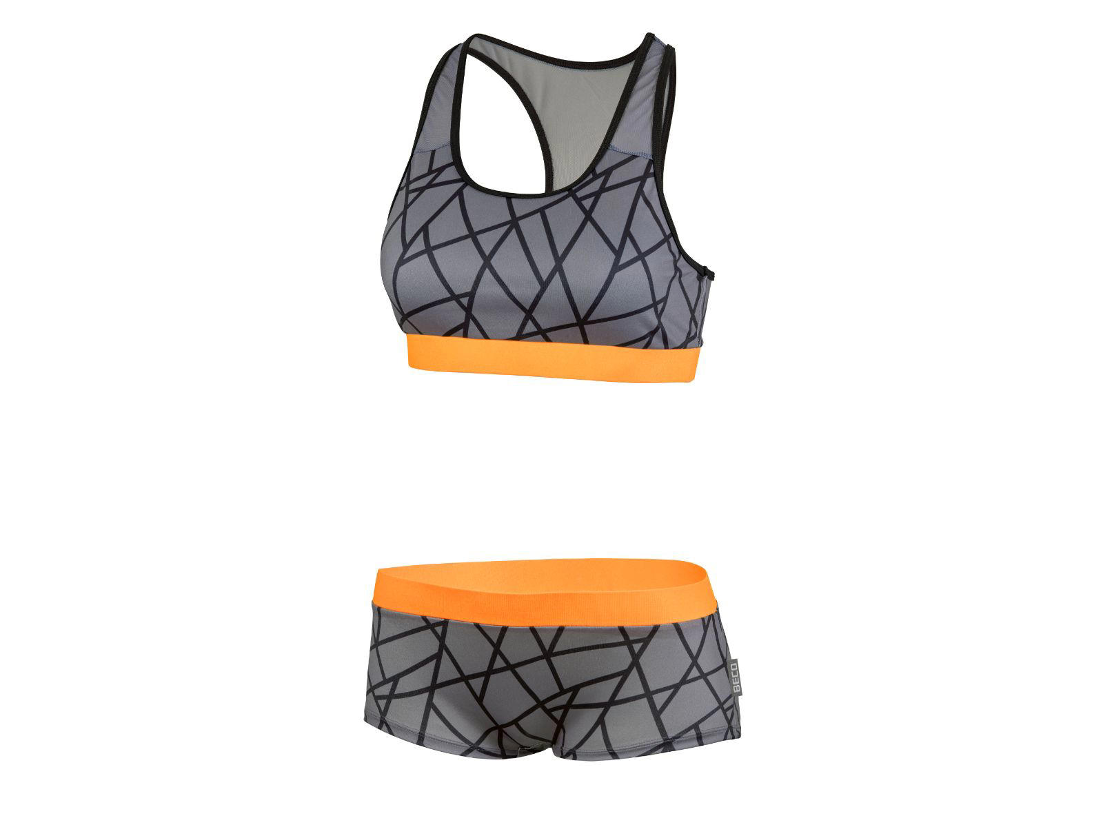BECO "Tangram Style" bikini til kvinder. Sporty design med grafisk sort mønster på gråt stof og iøjefaldende orange detaljer. Med behagelig croptop og hotpantsunderdel. Lavet i 100% polyester og med foring i polyester-/elastanblanding. UV-beskyttelse 50+. Med støttebånd under barmen. Med udtagelige skåleindlæg og B-skål.