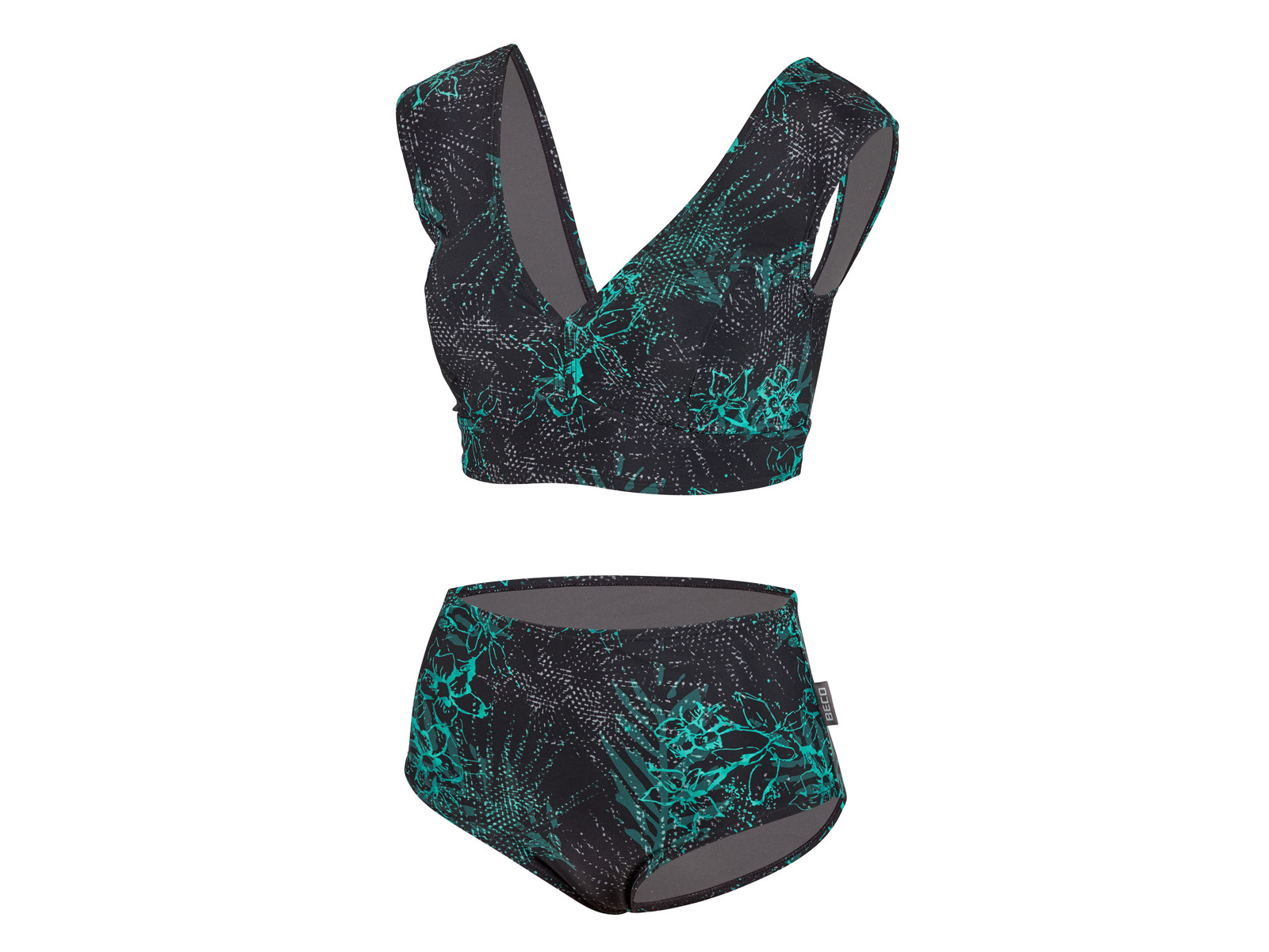 BECO ”Mint flowers” bikini til kvinder. Fortryllende blomster design i sort og turkis. Overdelen har brede skulderstropper, D-skål og indsyede indlæg. Bikiniunderdelen har høj talje med en sidelængde på ca. 15 cm og lav benskæring. 80% polyamid, 20% elastan.