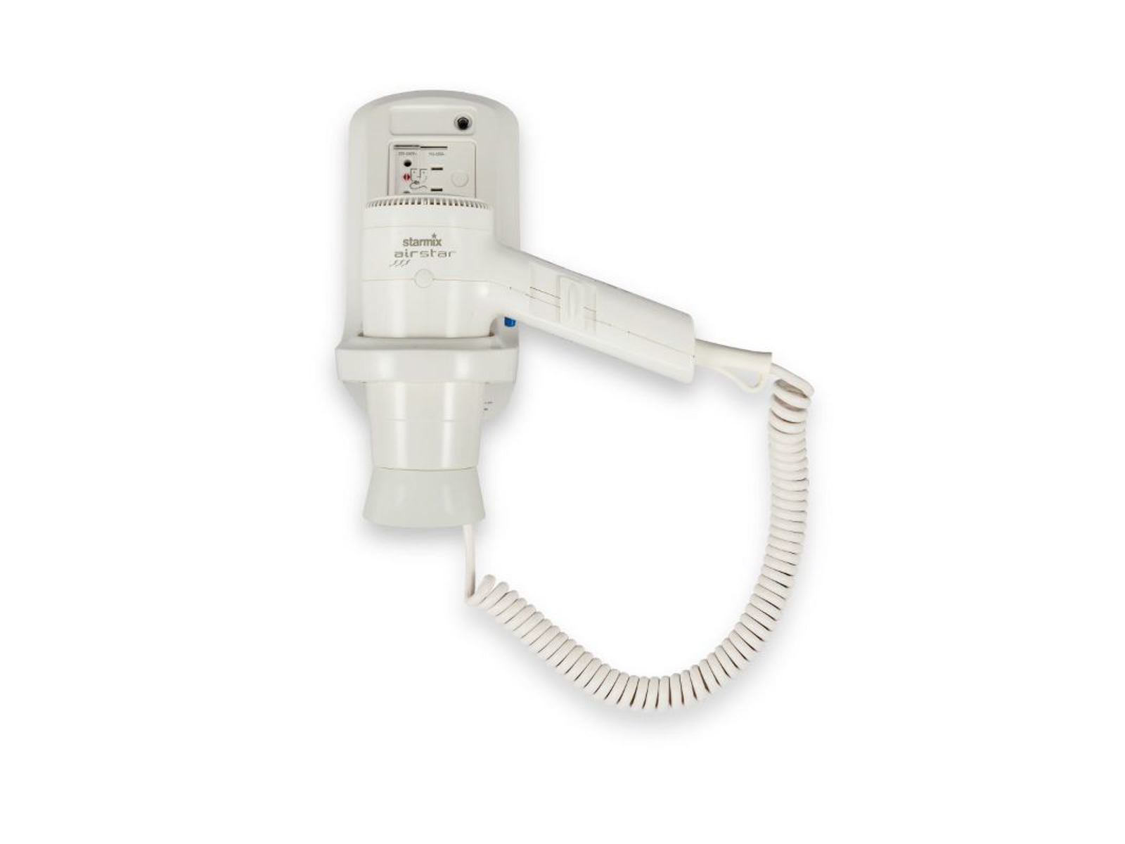 Starmix ”HFTW 12 R” håndholdt hårtørrer til omklædningsrum, baderum og hoteller. Effekt på 1200W og med fønnæb. Lavet i ABS-plast. Tre forskellige blæseindstillinger og on/off-knap. Spiralledning med længde på 0,5-2,0 m. Med vægholder med sensorkontrolleret lys og indbygget stikkontakt til barbermaskine.