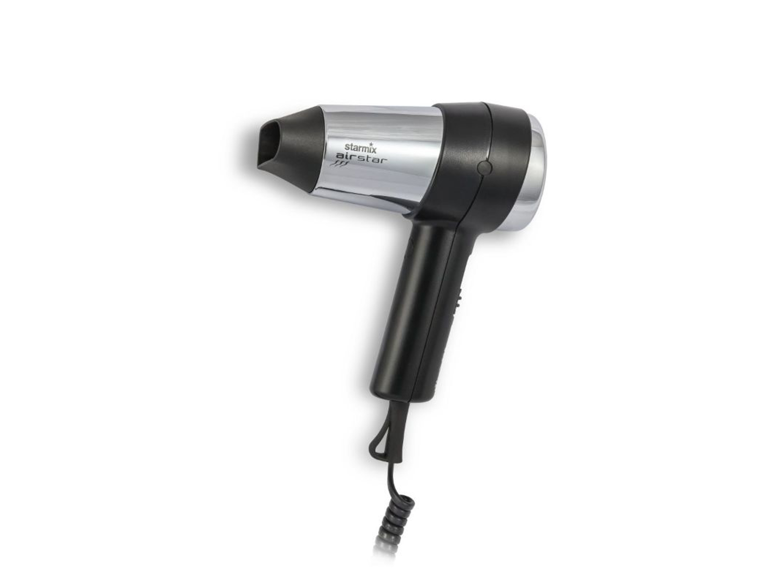 Starmix ”TFC 12” håndholdt hårtørrer til omklædningsrum, baderum, hotelværelser og andre professionelle sammenhænge. Effekt på 1200W og med fønnæb. Lavet i sort plast og krom – flot design. Fire forskellige blæseindstillinger. Spiralledning med længde på 0,5-2,0 m. Uden vægholder.