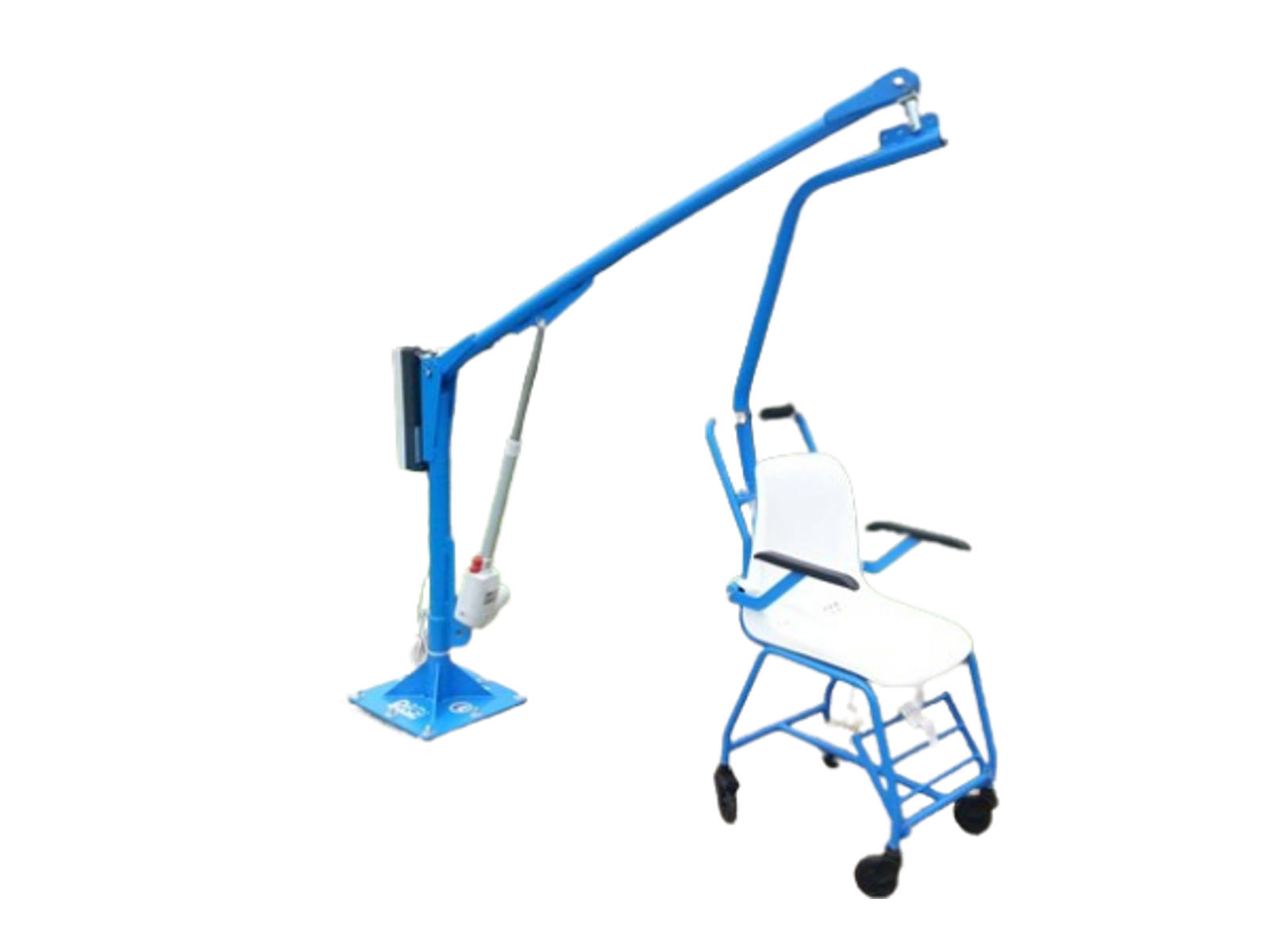 DigiProject “F145B” stationær handicaplift til svømmebade. Egnet til svømmebassiner uden kanter, f.eks. med overløbsriste eller til badebroer. Kan udstyres med sæde eller gynge. Monteres på gulv. Kan rotere 360°. Med justerbar armstøtte og flytbar benstøtte. Fjernbetjening med spiralledning. Max. belastning: 140 kg.