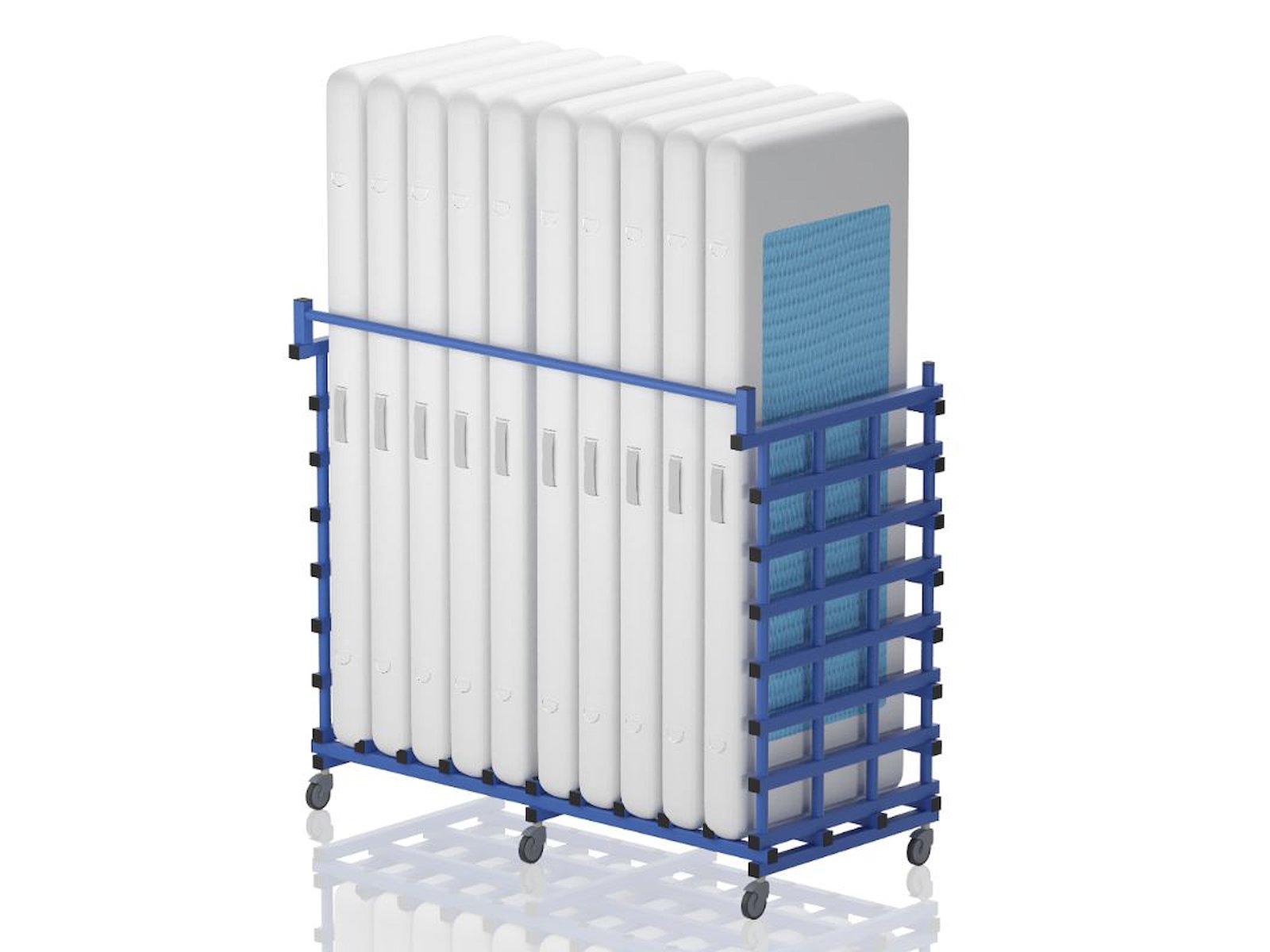 Vendiplas AQM(10)LOW-vogn til opbevaring af 10 x aquafitnessmåtter. Lav udgave. Lavet i slidstærkt og UV-/klorbestandigt PVC, som stort set ikke kræver nogen vedligeholdelse. Designet til vådrum og tåler temperaturer fra -40°C til +80°C. Mål: L 194 x B 102 x H 170 cm. Leveres samlet.
