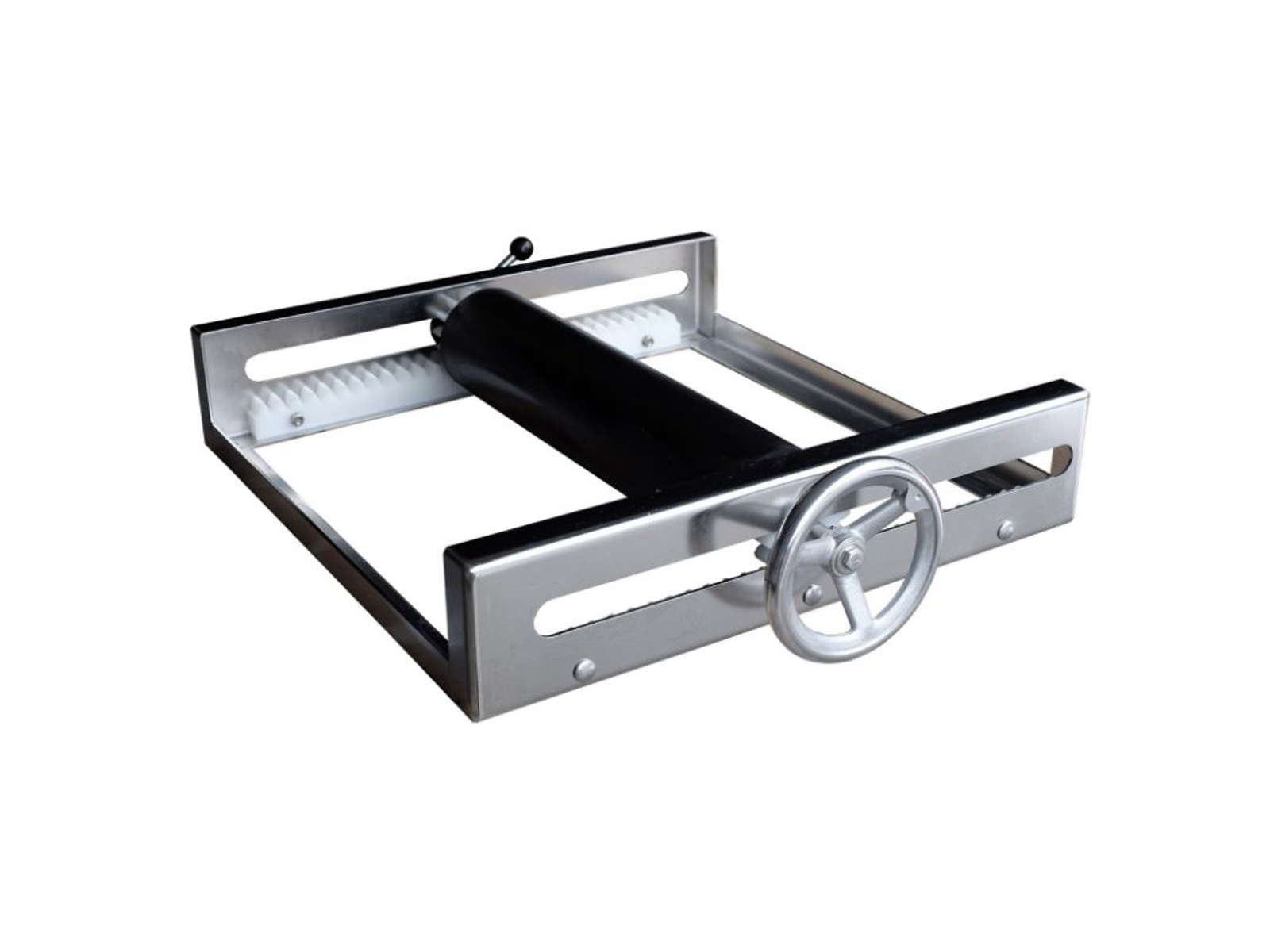 Rahn ”Rullemekanisme til GFK vippebræt” boks med drejehåndtag og rullevalse som bruges til at justere inden for springbrættets justeringsområde. Med bremse. Udført i V4A rustfrit stål som er elektropoleret.