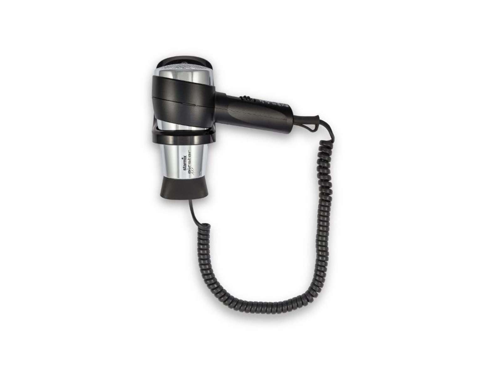Starmix ”TFCW 16” håndholdt hårtørrer til omklædningsrum, baderum, hotelværelser og andre professionelle sammenhænge. Effekt på 1600W og med fønnæb. Lavet i sort plast og krom – flot design. Fire forskellige blæseindstillinger. Spiralledning med længde på 0,5-2,0 m. Med vægholder med sensorkontrolleret lys.