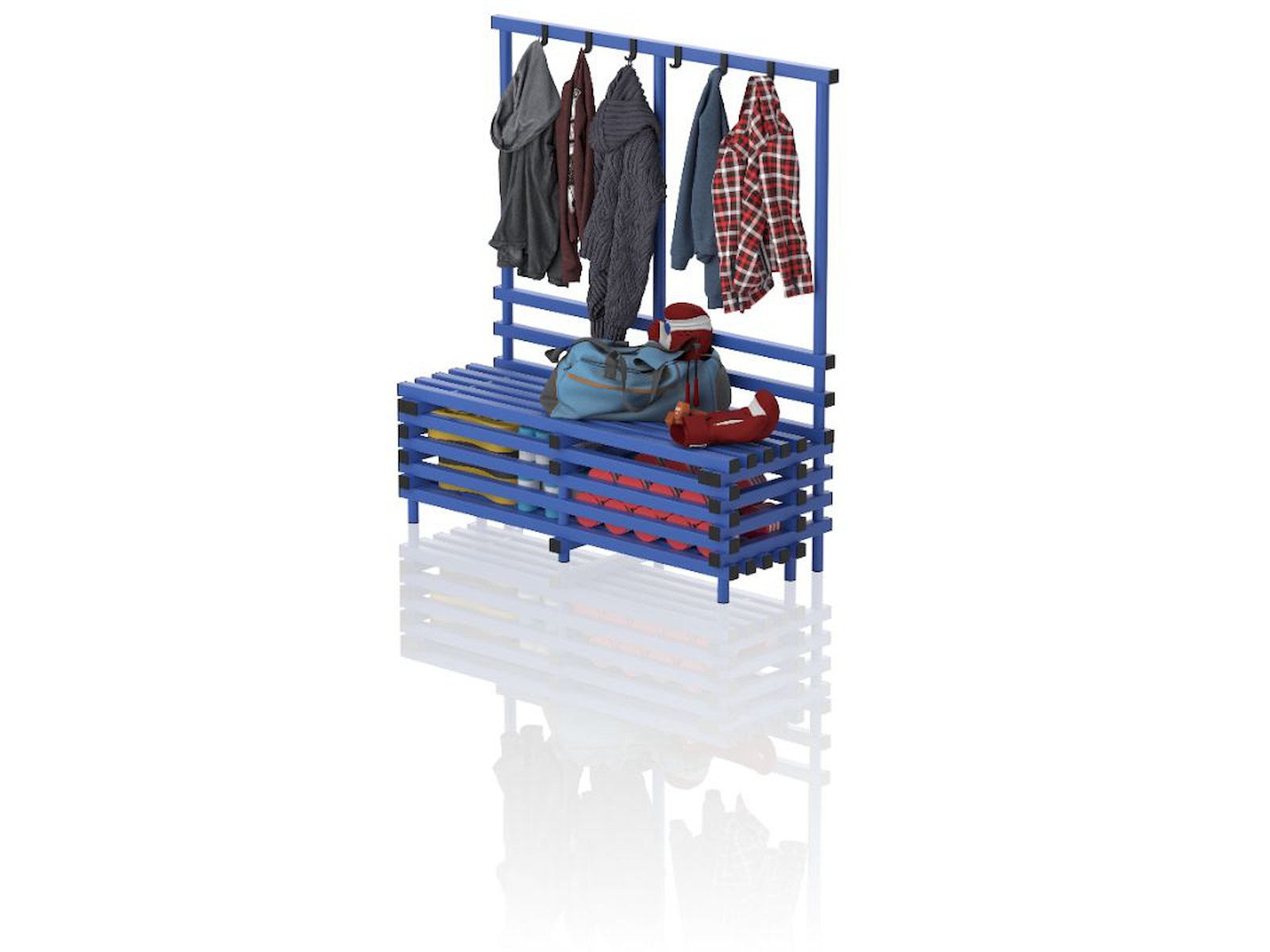 Vendiplas BH(ST)-bænk med opbevaring under sædet og knagerække. Lavet i slidstærkt og UV-/klorbestandigt PVC, som stort set ikke kræver nogen vedligeholdelse. Designet til vådrum og tåler temperaturer fra -40°C til +80°C. Mål: B 100/150/200 x D 57 x H 170 cm.