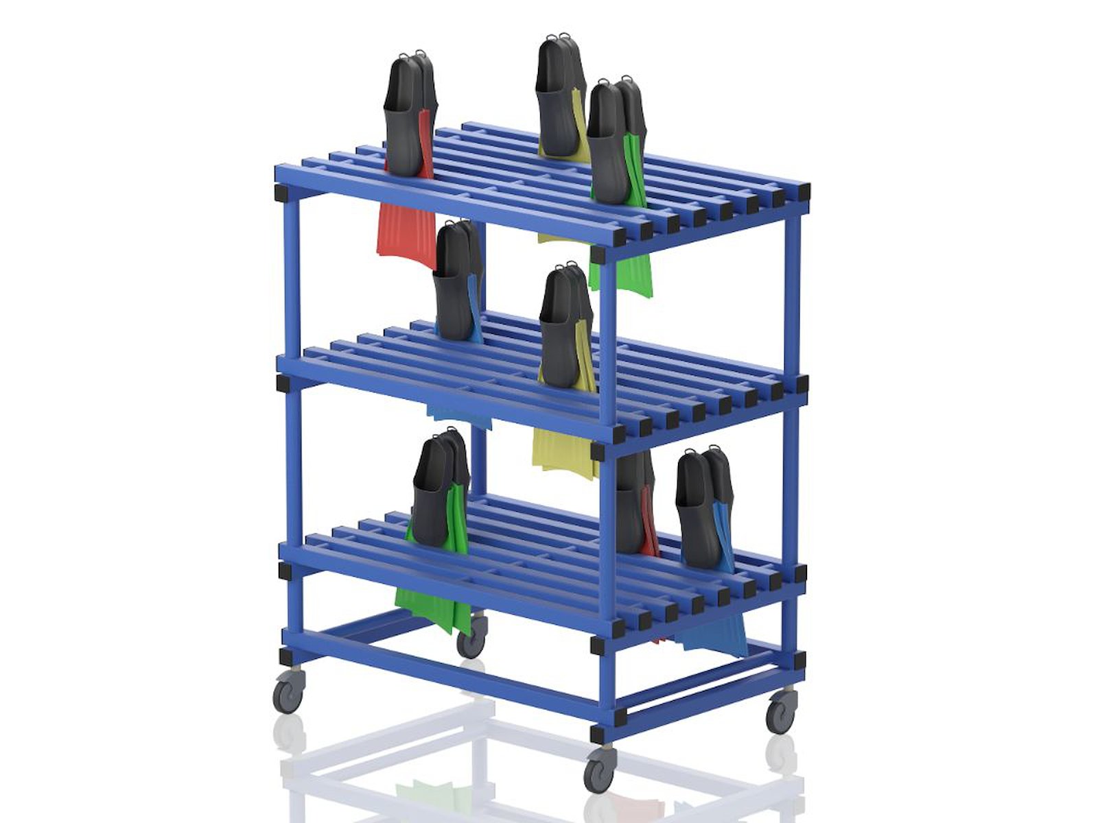 Vendiplas FH1200/800-vogn til opbevaring af svømmefødder. Med tre hylder med riller, som svømmefødderne kan stikkes ned i. Lavet i slidstærkt og UV-/klorbestandigt PVC, som stort set ikke kræver nogen vedligeholdelse. Designet til vådrum og tåler temperaturer fra -40°C til +80°C. Mål: B 120 x D 82 x H 150 cm.