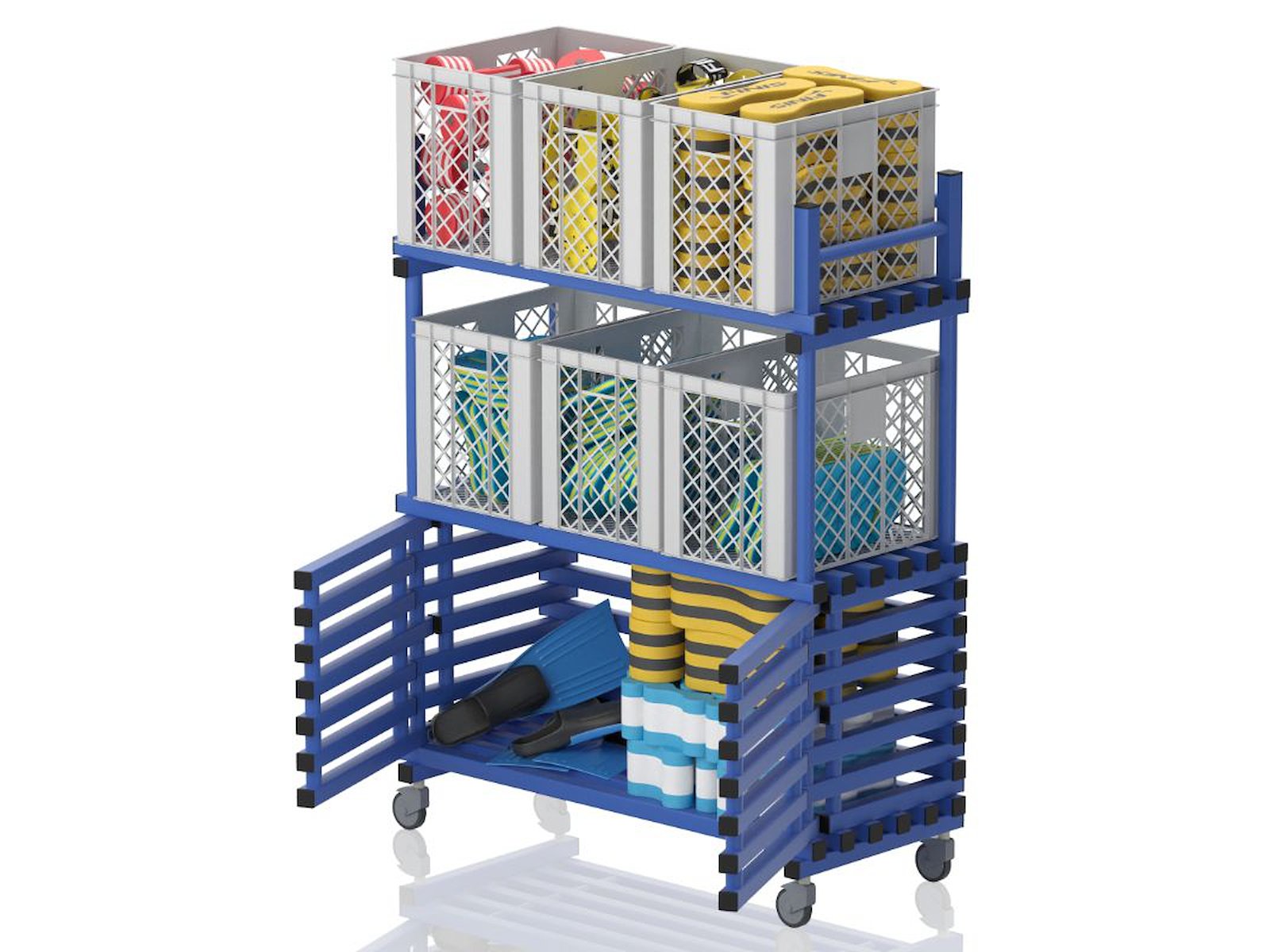 Vendiplas MS1360DR-vogn med tre faste hylder og låger forneden til opbevaring af diverse svømmeudstyr. Lavet i slidstærkt og UV-/klorbestandigt PVC, som stort set ikke kræver nogen vedligeholdelse. Designet til vådrum og tåler temperaturer fra -40°C til +80°C. Mål: B 138 x D 60 x H 177 cm.