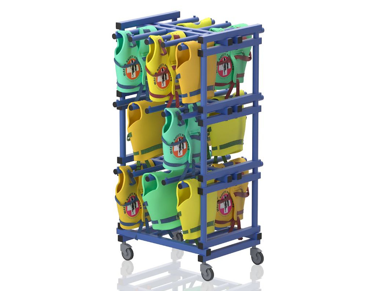 Vendiplas MSL(30)-vogn til opbevaring af svømmeveste og redningsveste. Kan rumme 30 veste. Med bøjler, som vestene kan hænge på. Lavet i slidstærkt og UV-/klorbestandigt PVC, som stort set ikke kræver nogen vedligeholdelse. Designet til vådrum og tåler temperaturer fra -40°C til +80°C. Mål: L 85 x B 84 x H 169 cm.