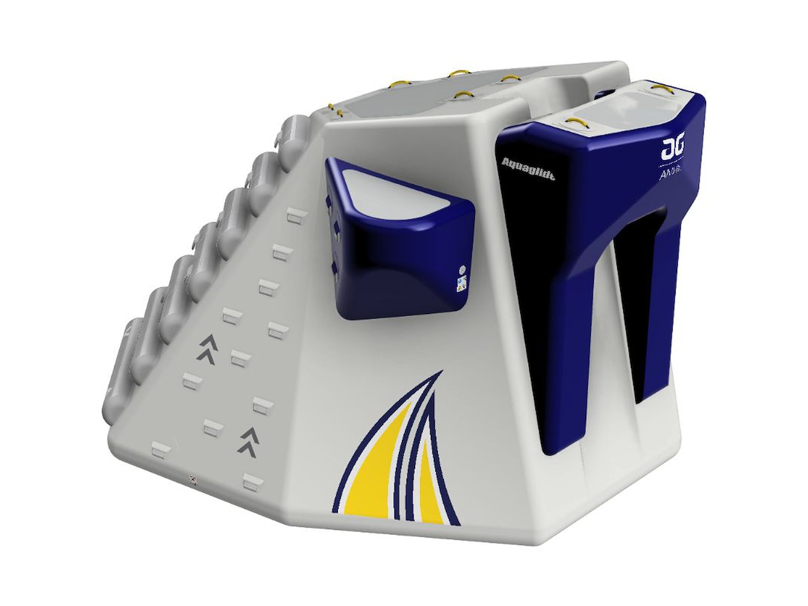 Aquaglide ”Anvil” klatre-/udspringsmodul til vandpark. En af de nye, innovative moduler, som både byder på en udfordrende klatrebane, udspringsplatforme og stejl rutsjebane. Kapacitet: 8 brugere. Min. vanddybde: 2,43 m. Sikkerhedsafstand: 4,50 m. Egnet til meget store bassiner eller open water. Mål: L 551 x B 481 x H 300 cm.