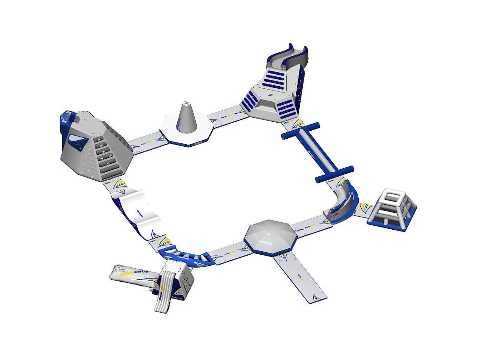Aquaglide ”Ring Monsoon S50” ringformet aktivitetsbane til open water og havnebade. Rummer mange af Aquaglides signaturmoduler, f.eks. Anvil, Loki Corner, Jungle Jim og King of the Mountain. Kapacitet: 50 brugere. Mål: 25,6 x 27,1 m. Min. dybde: 2,78 m.