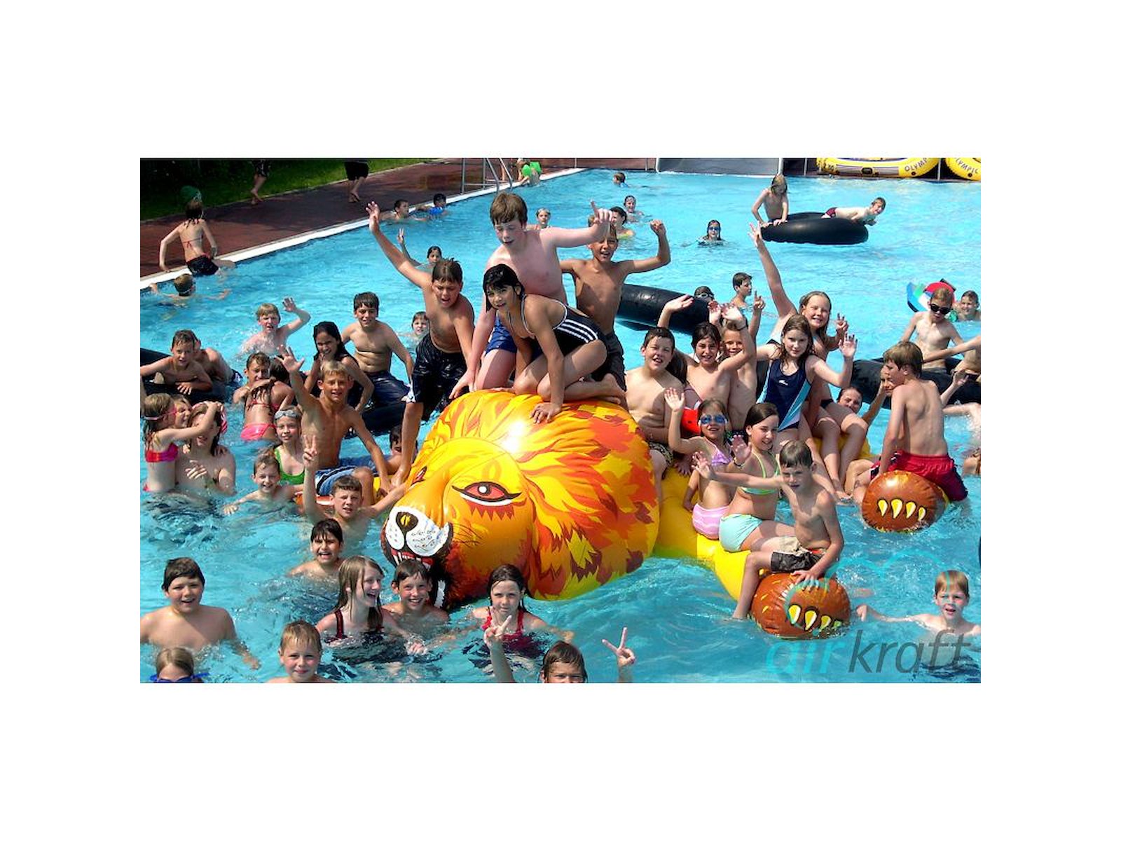 Airkraft kæmpestort badedyr formet som en sej og farlig løve. Løven har hoved, krop og ben og indbyder til, at børn og barnlige sjæle skal kravle, sidde og balancere på den - og ikke mindst bruge den som platform til at hoppe i vandet fra. Løven måler L3,8 x B2,5 x H1,0 m.