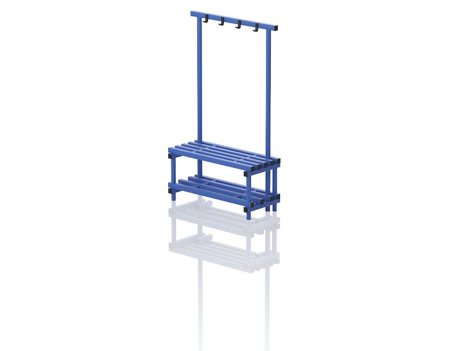 Vendiplas BH1000/450-bænk med knagerække og bundhylde til opbevaring af f.eks. sko, tasker og tilbehør. Lavet i slidstærkt og UV-/klorbestandigt PVC, som stort set ikke kræver nogen vedligeholdelse. Designet til vådrum og tåler temperaturer fra -40°C til +80°C. Mål: B 100 x D 45 x H 170 cm. Nem og hurtig at samle.