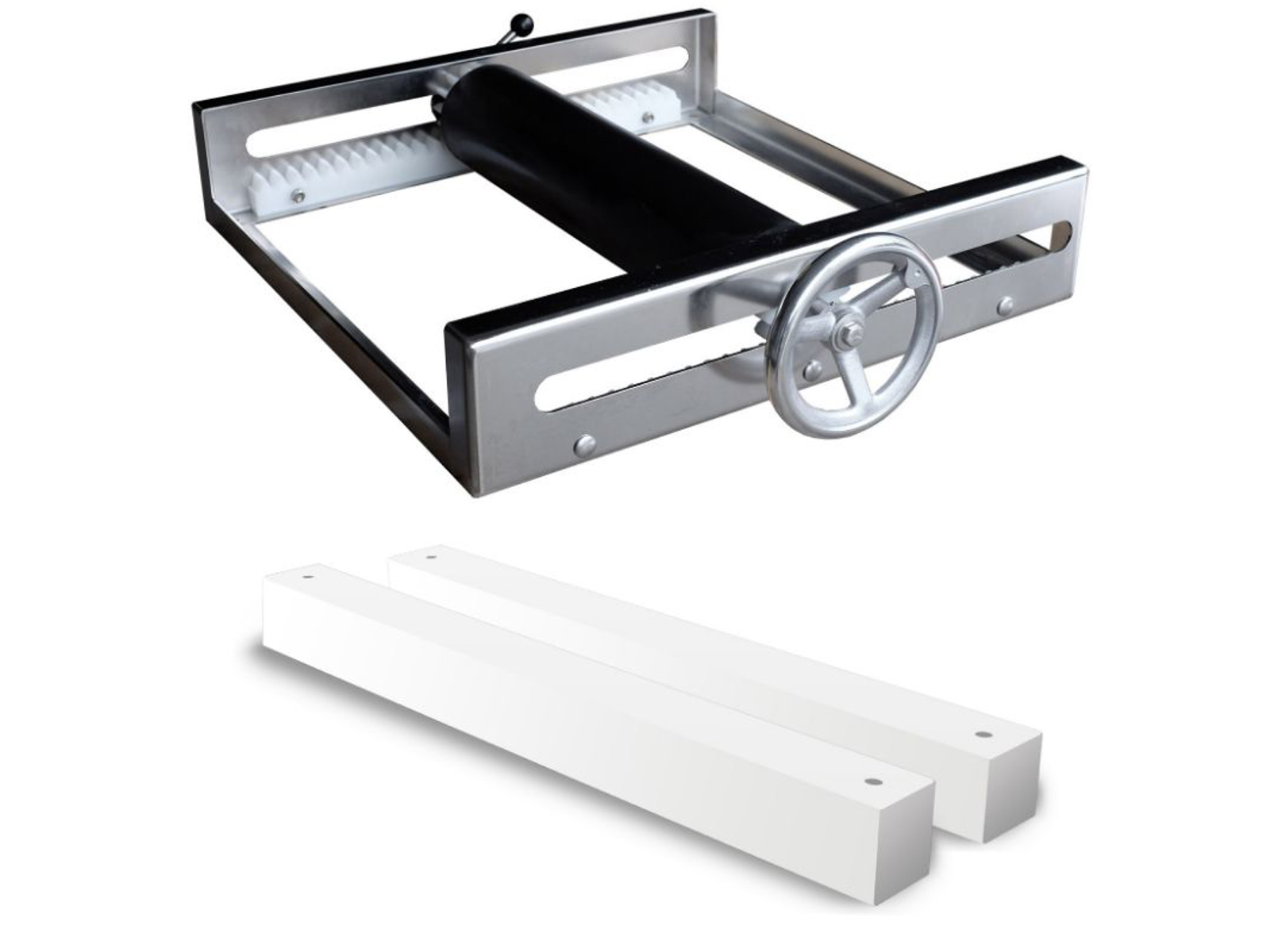 Rahn ”Rullemekanisme til GFK-vippebræt med kompensations-skinner” boks med drejehåndtag og rullevalse som bruges til at justere inden for springbrættets justeringsområde. Med bremse. Udført i V4A rustfrit stål som er elektropoleret.