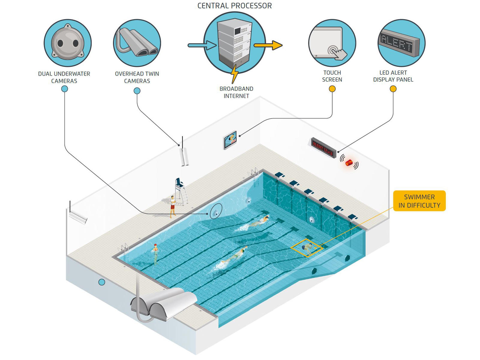 Poseidon druknealarm til offentlige svømmebassiner. Kan bruges i alle bassiner og skræddersyes til dine faciliteter. Bruger loft- og undervandskameraer med unik teknologi til at overvåge hele bassinet konstant. Alarmerer ved potentiel drukning efter 10 sekunder. Hurtig reaktion er altafgørende for livredning og forhindring af permanent skade.