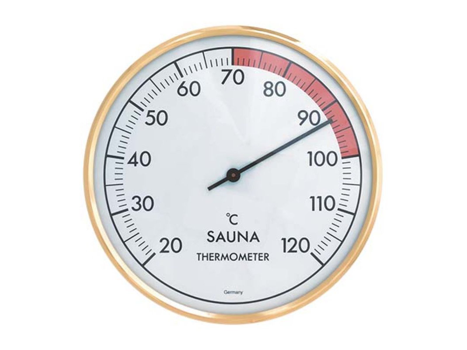 Finnsa "Sauna termometer Ø 162 mm" plast termometeret har en ramme i guldfarvet metal.