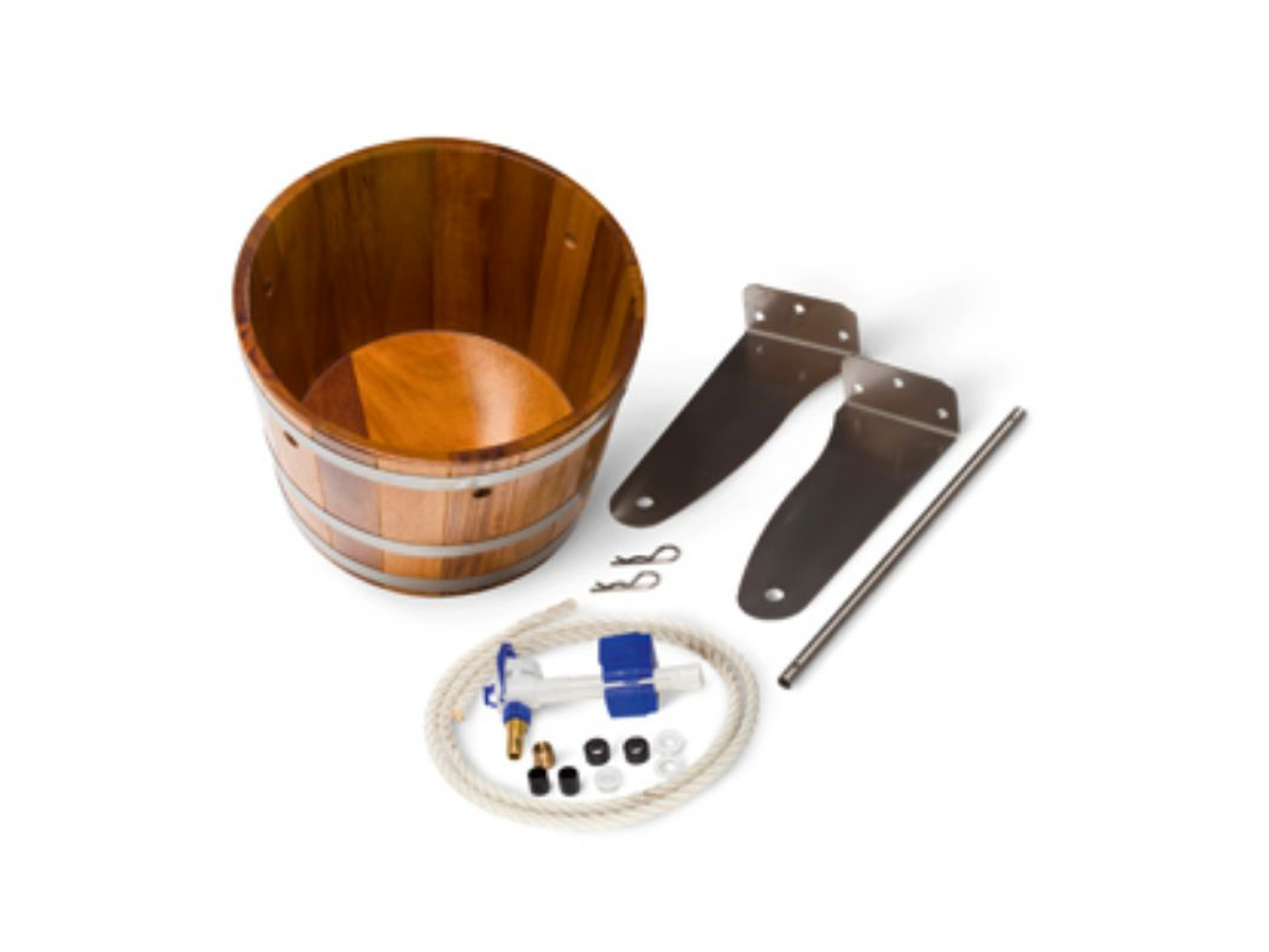 Finnsa ”Hængespand indvendig version, 29 L” udført i Kambalatræ, 3 rustfri ståldæk. Ø 41 cm. H 31,5 cm. Træktov PES-reb. Inklusiv komplet ophængningsanordning udført i rustfrit stål, samt flydeventil. Takket være den kontinuerlige stabile rotationsakse kan den monteres enten på væg eller loft. Spanden har gennemsigtig hygiejnisk tætning.