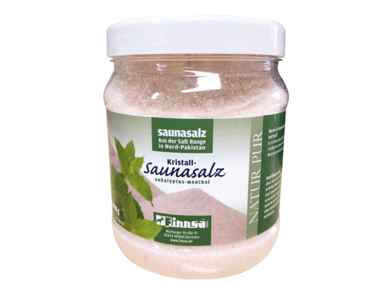 Finnsa ”krystal saunasalt” udvindes i det nordlige Pakistan (Salt Range) på Himalayas skråninger, sorteres eller sigtes i hånden og er af højeste kvalitet. Denne saunasalt fremmer svedproduktion og skaber en vidunderlig peeling effekt. Ideel til brug i sauna eller bad. Den er rig på mineraler, helt naturlig og ikke bearbejdet.