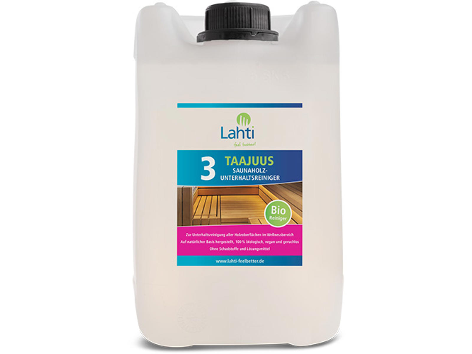 Finnsa "Lahti TAAJUUS Sauna-vedligeholdelsesrens 5 l" er en biologisk og vegansk rengøringsløsning til ugentlig pleje af saunabænke og ubehandlede træoverflader. Fremstillet på naturlig basis uden skadelige stoffer eller opløsningsmidler. Skånsom, miljøvenlig og effektiv.