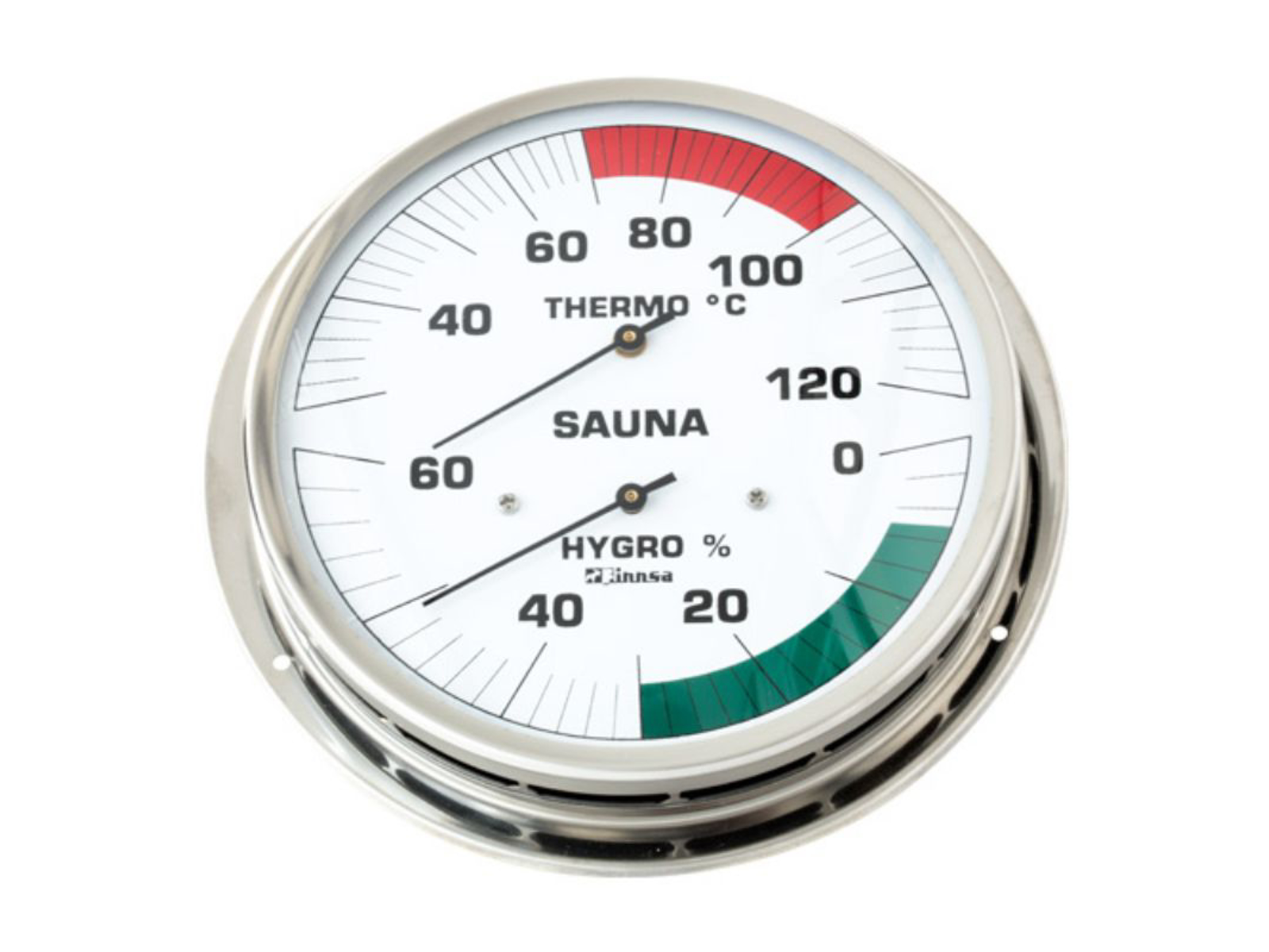 Finnsa "Sauna hygroterm m/flange 130 mm -Classic-” er en kombineret præcisions måleenhed med saunahygrometer og saunatermometer. Måleområde: Hygrometer 0 – 60 % relativ luftfugtighed, termometer 30 – 120 C. Sauna måleområderne er kontrasterende i farve. Urkasse i rustfrit stål. 130 mm skala. Med skrueflange.