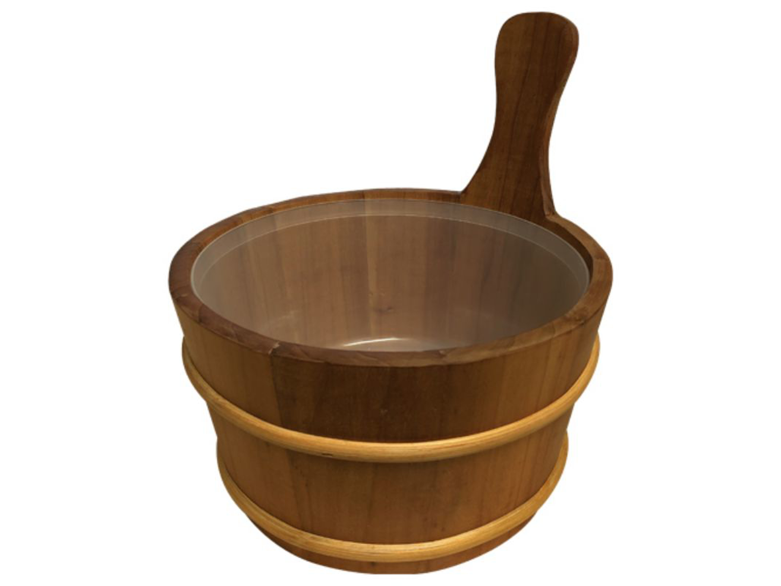 Finnsa ”Saunaspand varmebehandlet aspetræ - 4 liter, med indsats” den optimale saunaspand der aldrig lækker. Velegnet til enhver sauna. Mål: ca. 15 cm høj, håndtagstav 27 cm høj, diameter top 25,5 cm, diameter bund 21 cm. Vægt: ca. 1 kg