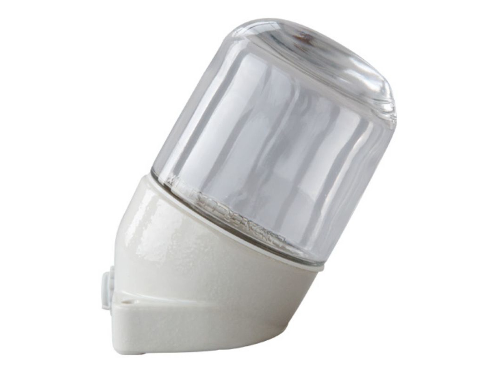 Finnsa ”Saunalampe Skrå/klar, 40/60W E27” hvid keramisk bund med klar glas. Egnet op til 125 grader. Ved brug som loftslampe maks. 40W E27, ved brug som væglampe maks. 60W E27. Mål ca.: 13 cm lang, glas 8,5 cm