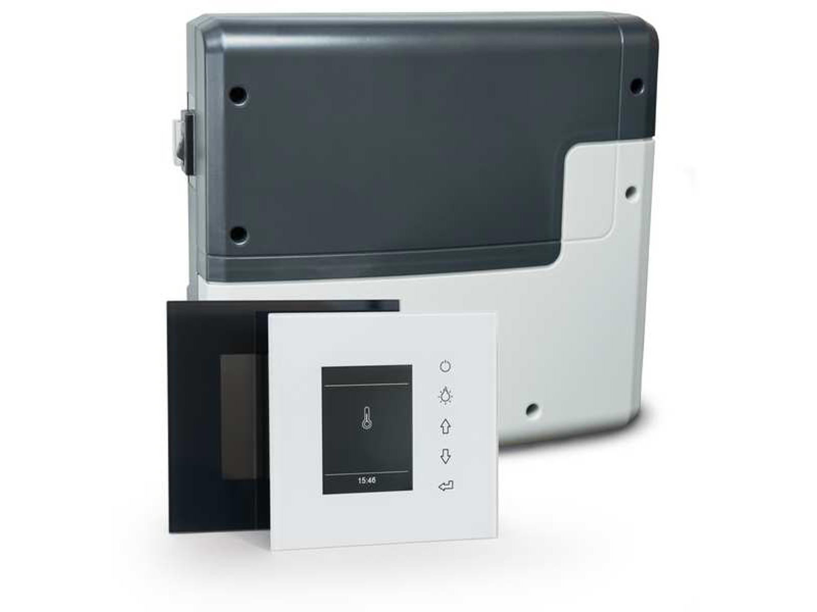 EOS Styring til IR-kabiner InfraStyle Hvid, er en luksuriøs kontrolenhed med glasfront og berøringsknapper. Den giver præcis temperaturstyring fra 30-70 °C og har en maksimal effekt på 3,5 kW. Ideel til både private og professionelle installationer med moderne design og høj driftssikkerhed.