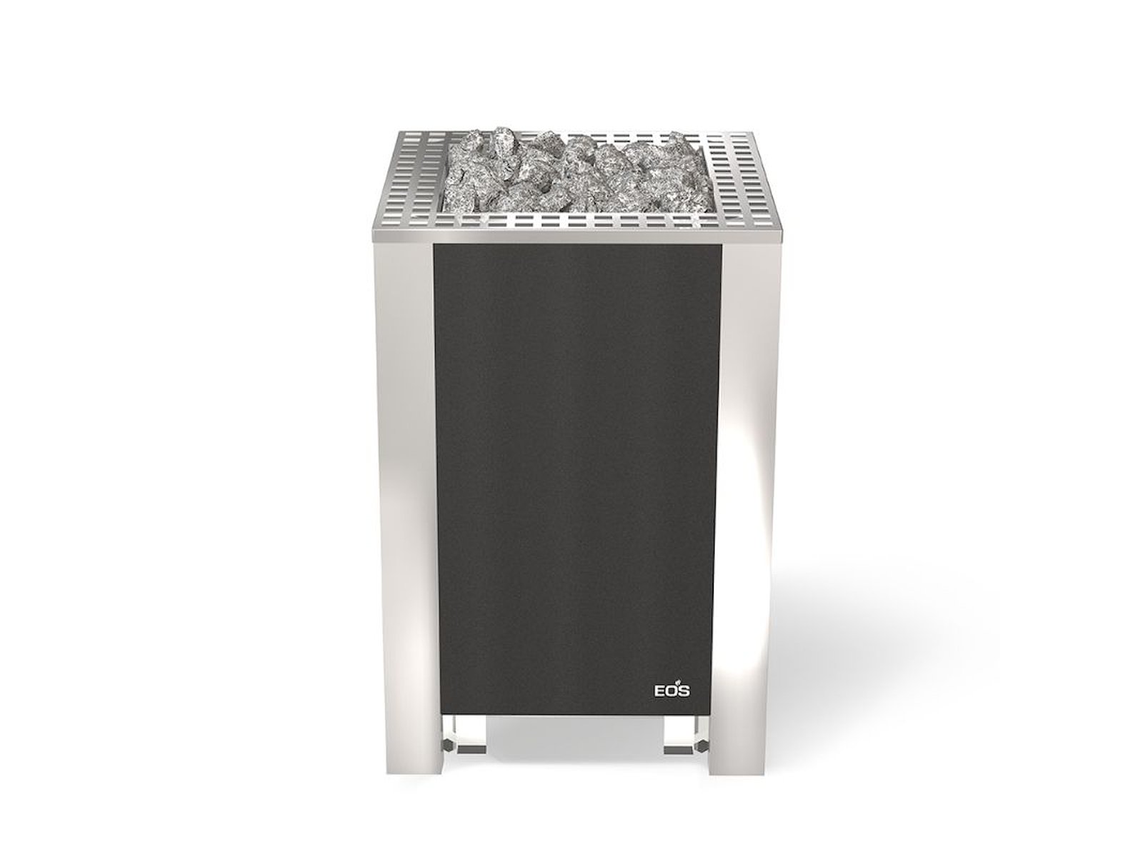 EOS "Saunaovn BlackRock" Premium saunaovn til finsk sauna, til intensiv kommerciel brug i saunaer på 14-30 kubikmeter. Forstærket konstruktion og et stilrent design. EOS "BlackRock" er ens på alle sider og har altså ikke en typisk bagside (kabler i bunden). Egnet til at stå frit midt i rummet eller bag glaspaneler. Stenkurv op til ca. 40 kg sten.