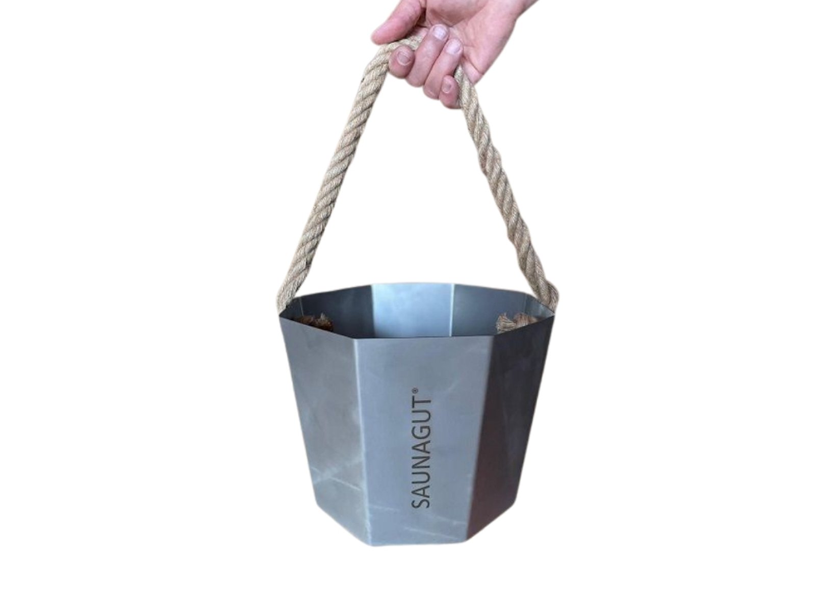 SAUNAGUT® Saunaspand er en stilren saunaspand i glasperleblæst rustfrit stål med naturreb som håndtag. Med en kapacitet på op til 6 liter er den ideel til aufguss i både privat og professionel sauna. Designet af SAUNAGUT® og fremstillet med fokus på holdbarhed, funktion og nordisk æstetik.