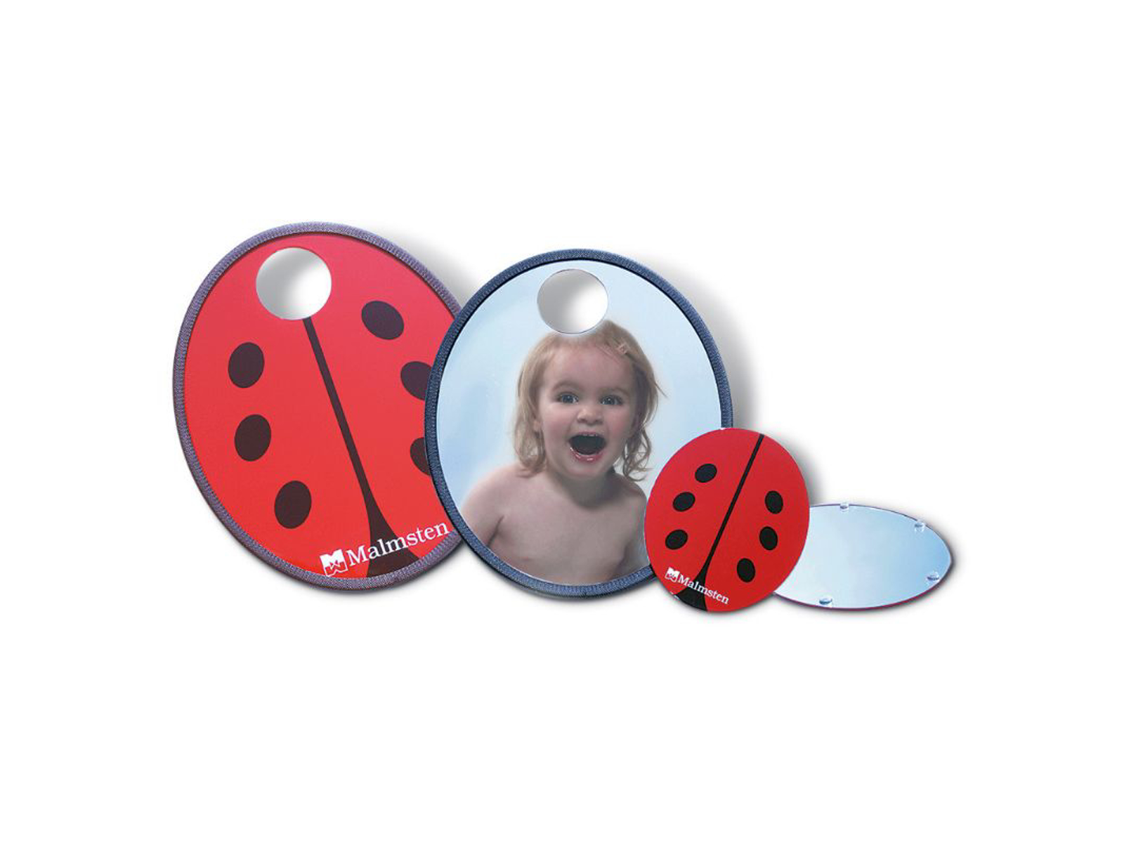 Malmsten børnespejl med mariehøne bagpå. Spejlet har gribehuller og er udført i slidstærkt akryl. Kan bruges både til svømmetræning og leg.