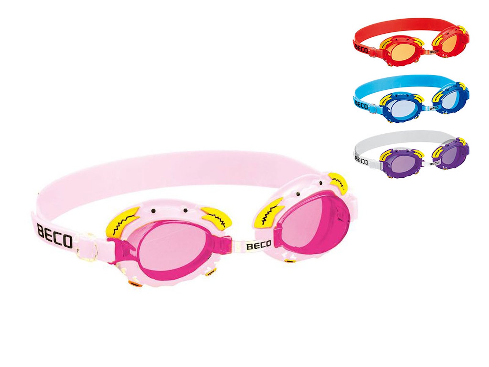 BECO ”Palma” svømmebrille til børn fra 4 år. Med krabbekløer i fin, gul kontrastfarve på brillerammen. Med ramme og strop i blød, fleksibel silikone, som slutter tæt uden at stramme. Justerbar strop og næsebro sikrer en perfekt pasform. Linser i polycarbonat behandlet med anti-dug og tonet i samme farve som brillerammen. 100% UV-beskyttelse.