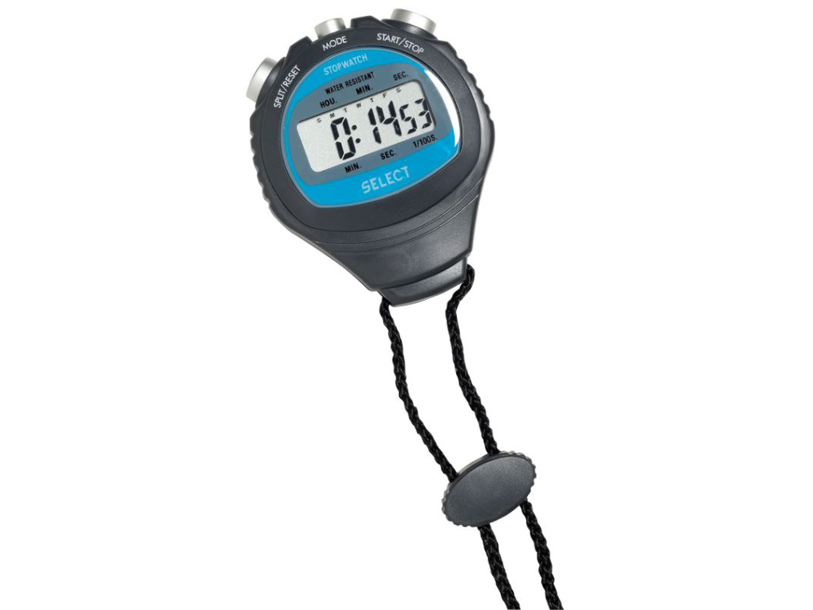 Stopur til svømmetræning. Vandresistent og med split/reset-funktion. Nemt at betjene. Timer/minutter/sekunder. 1/100 sekunder. Ur- og datoviser. Mærke: Select.